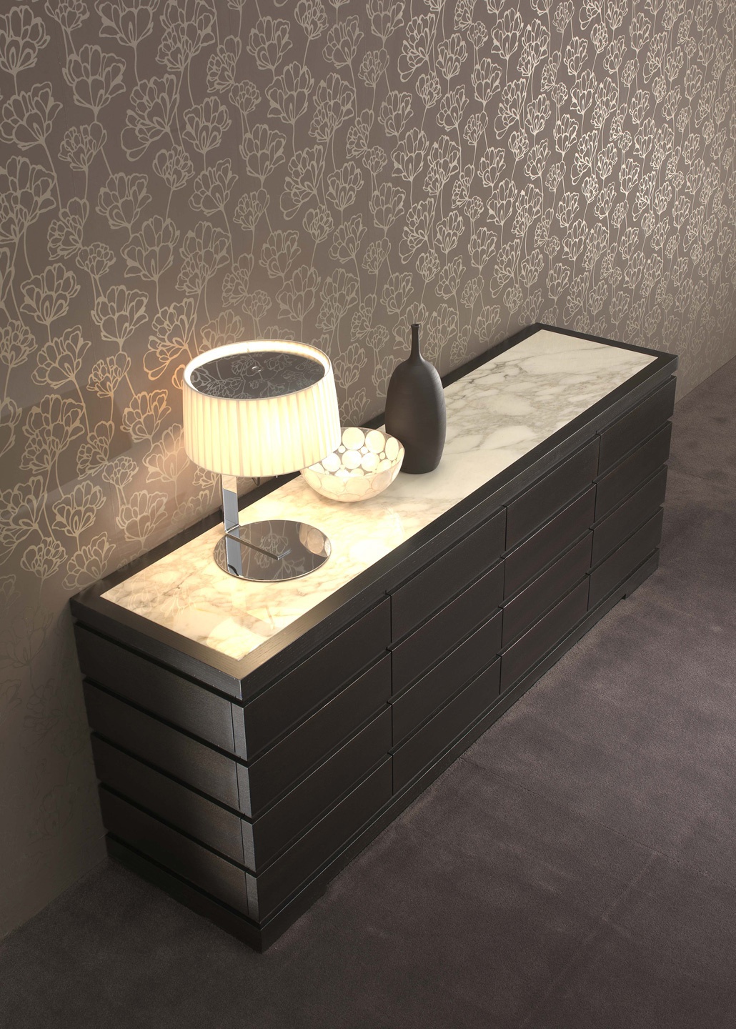 Chest Velasca, designer Joe Gentile from the Italian producer Galimberti Nino. The frame is made from natural wood ash, the variant with marble of different finishes. The model with four doors and two drawers. Colours in stock. A modern solution for your living room.