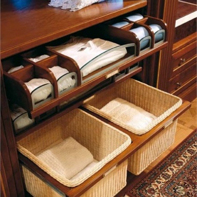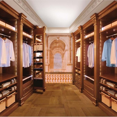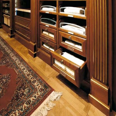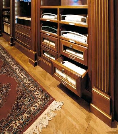 Royal Luxury dressing room from Faoma the Italian manufacturer. The product made of cherry wood with decoration in gold foil. The model is equipped with led backlight. Pull-out pilasters in you can store documents and family values, as they can be opened only after entering a personal code. A chic choice for dressing room in the classical style. Colors: brown, natural color of the wood.