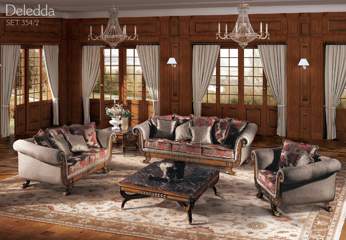Sofa set Deledda from the Italian manufacturer Angelo Cappellini. Set consists of two sofas, armchairs and coffee tables. Sofas and armchair with a low backrest and rounded armrests. The seat cushion is removable. The upholstery is made of textile. Decoration are decorative cushions. Original curved legs are decorated with carved elements. Complement set the coffee table in the center of the room and a small predelany table that you can use as coffee, coffee, phone or vase. Tabletops are made of marble. The base is also decorated with carvings. Finishing made with lacquer.