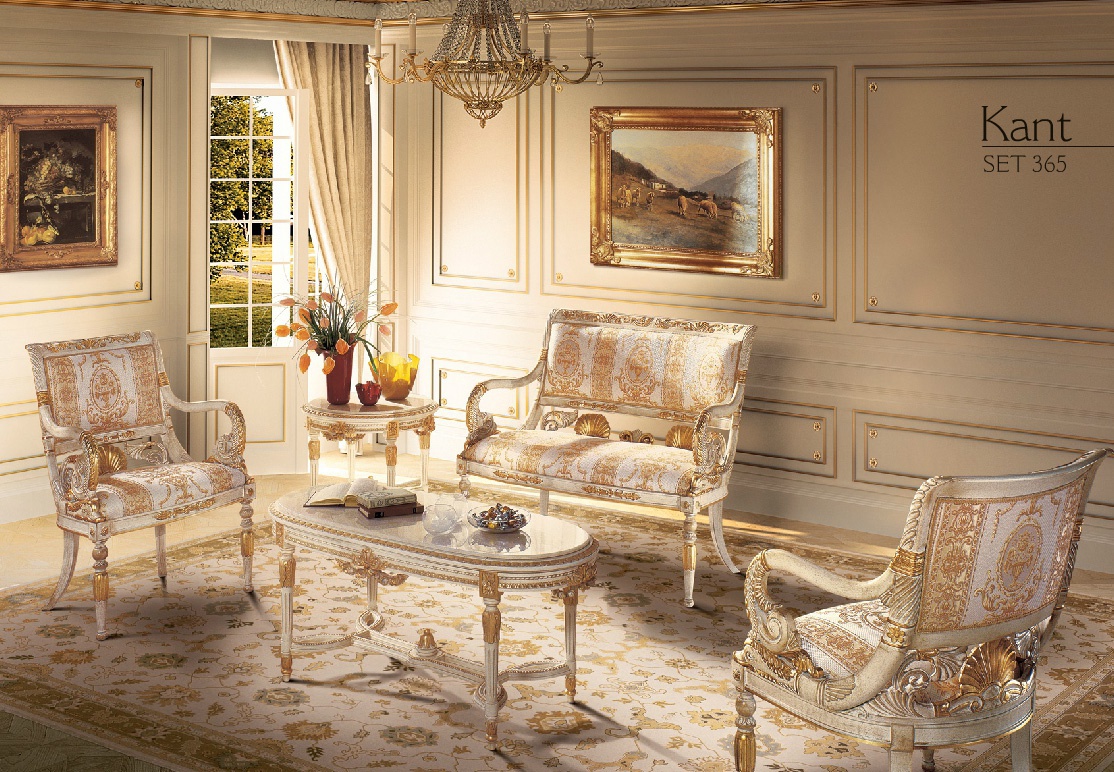 Sofa set Kant from the Italian manufacturer Angelo Cappellini. Set includes a sofa, armchairs and coffee tables. A sofa designed for two persons. Back and seat upholstered with textile. The armrests are rounded, and edged back into the frame. Decorate the sofa and chairs decorative carvings with gold leaf. Complement set centre table with oval top and round small table for flower vases. Countertops made of marble. All the items of furniture for the headset is made of wood and decorated with hand carved with gilding.