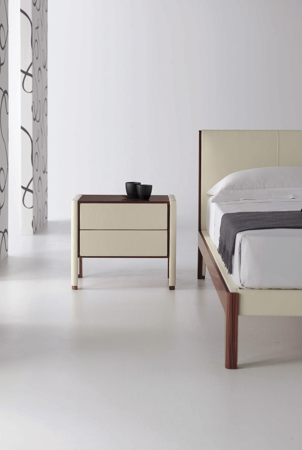 Double bed with upholstered headboard Mirago from the Italian producer Galimberti Nino. The model is made in modern style, designer Fabio Crippa. The frame and legs are made from solid ash, American walnut or rosewood. Headboard upholstered in fabric or leather, including received from the client. Colours in stock. A great option for decorating your bedroom.