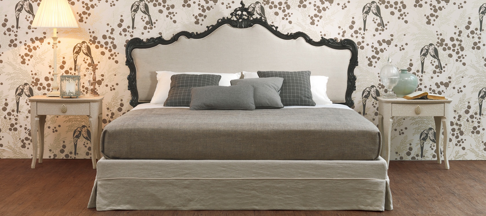 Double bed with upholstered headboard from Toscano Italian producer Galimberti Nino. The model is executed in classical style with elements of art Deco, designer Joe Gentile. The frame and legs made of solid beech wood. Headboard upholstered in fabric colours back in stock. The design complements the hand-carved.