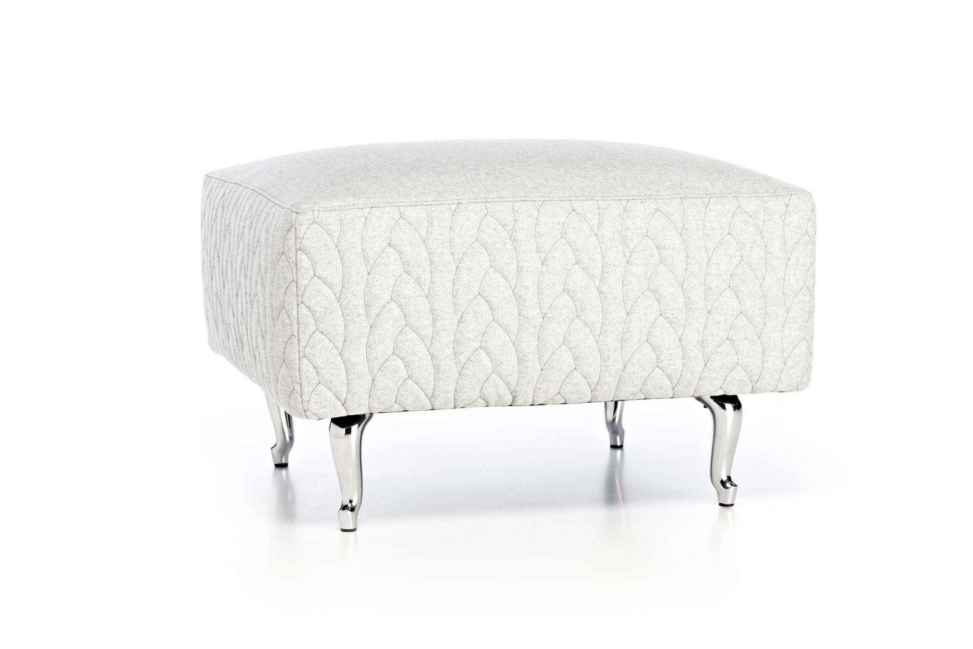 Square stool Delft Grey Jumper from the Dutch manufacturer Moooi. The model on the basis of chrome steel, legs made of metal filler - polyurethane foam of different hardness. Cover made of 100% wool, decorated with braid, colors to choose from the range of the manufacturer. Designer addition to your interior.