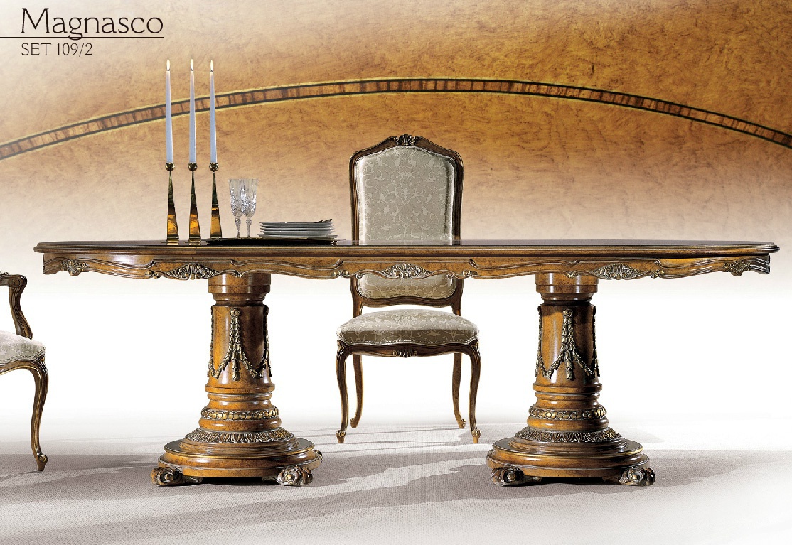 Set for the dining room Magnasco from the Italian manufacturer Angelo Cappellini. Set includes dining table with oval tabletop, chairs with high back and two buffets. The table with massive base is decorated with carved pattern handmade. The chairs are available with armrests and without. The upholstery of the chairs - the fabric is from a range of companies. One buffet high, semi-circular form with glazed doors and glass shelves and four wooden doors at the bottom. A sideboard of similar design equipped with four doors and drawers. Set in the historic style made of wood and decorated. Finishing made with lacquer. Colours in stock.
