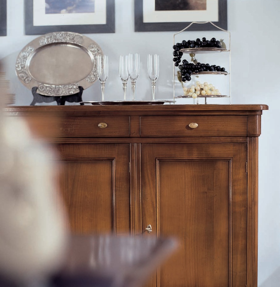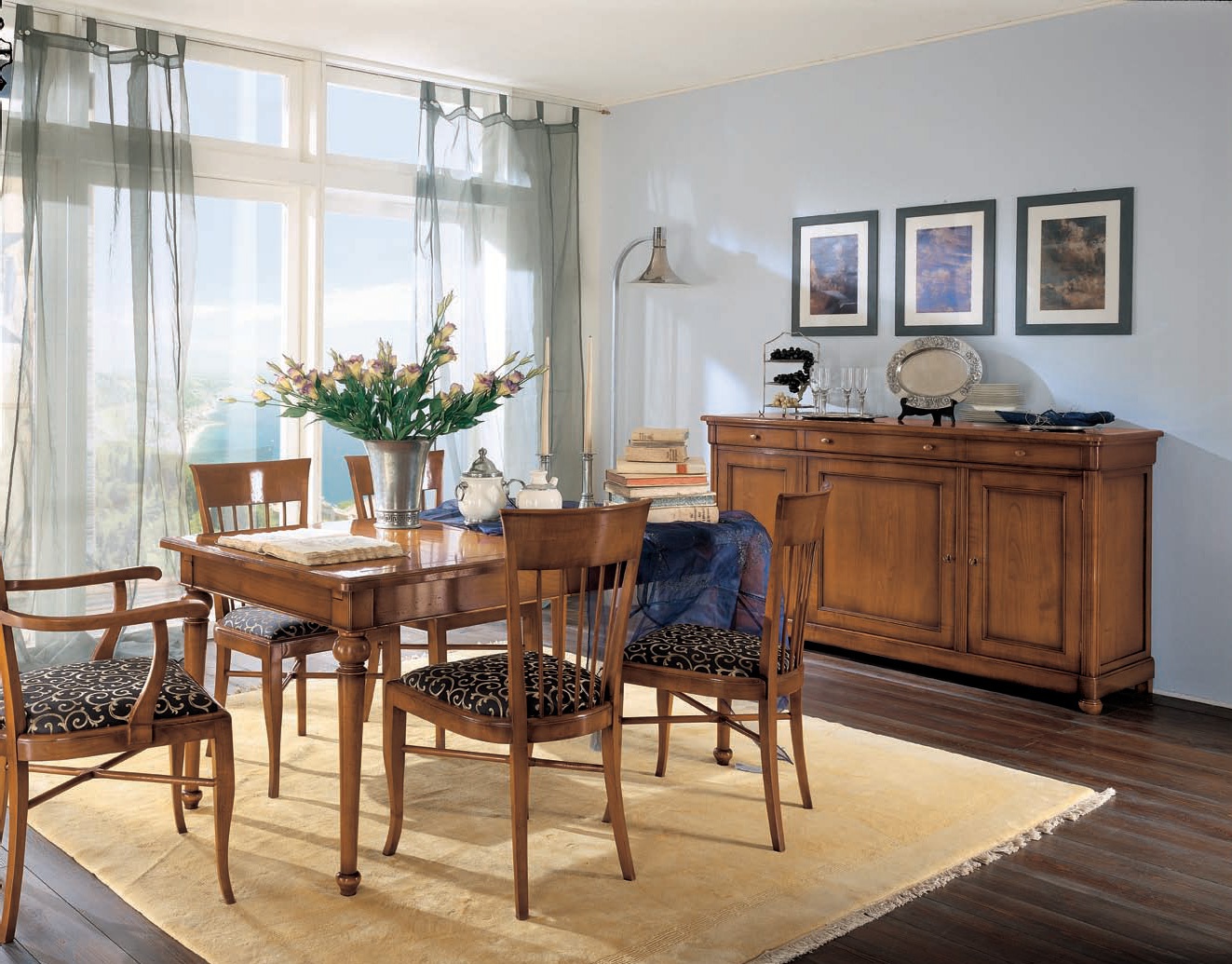 Set for the dining room Taormina Italian manufacturer Bizzotto. The presented model dining table, chairs and sideboard. Rectangular table, folding. Hard chairs with high backs, seats upholstered in fabric, colors to be selected from the range of the factory. The rectangular sideboard with hinged doors and drawers. Color light tone of wood. The perfect solution for interior dining room in classic style.