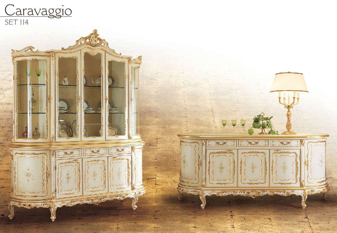 Set for the dining room Caravaggio from the Italian manufacturer Angelo Cappellini. Set includes dining table, chairs with high back and two buffets. The table of rectangular shape with rounded corners. The chairs are available with armrests and without. The seat and backrest cloth are made from a range of companies. One buffet high, semi-circular form with glazed doors and five glass shelves and bottom wooden doors. A sideboard of similar design equipped with five doors and three drawers. Furniture for headset in Baroque style made of wood, covered with white lacquer and decorated with carved decoration with gilding.