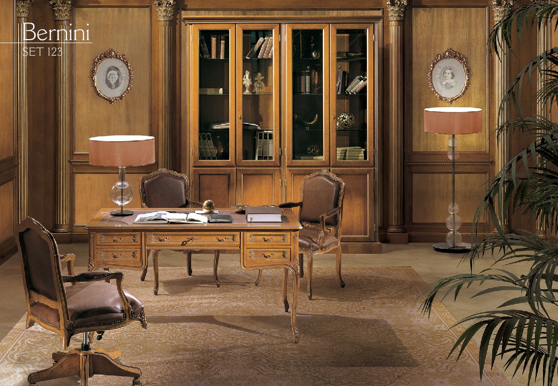 Headsets for office Bernini from the Italian manufacturer Angelo Cappellini. Set includes a Desk, a bookcase, a chair on wheels and chairs with armrests. The table on bent legs equipped with five drawers, and the top covered by skin. Swivel chair on castors and the chairs with armrests upholstered in leather from the company portfolio. On the arms have soft pads. The bookcase is offered with four glazed doors and glass shelves. Furniture for the headset is made of wood and decorated with carved decoration. Finishing made with lacquer. Colours in stock.
