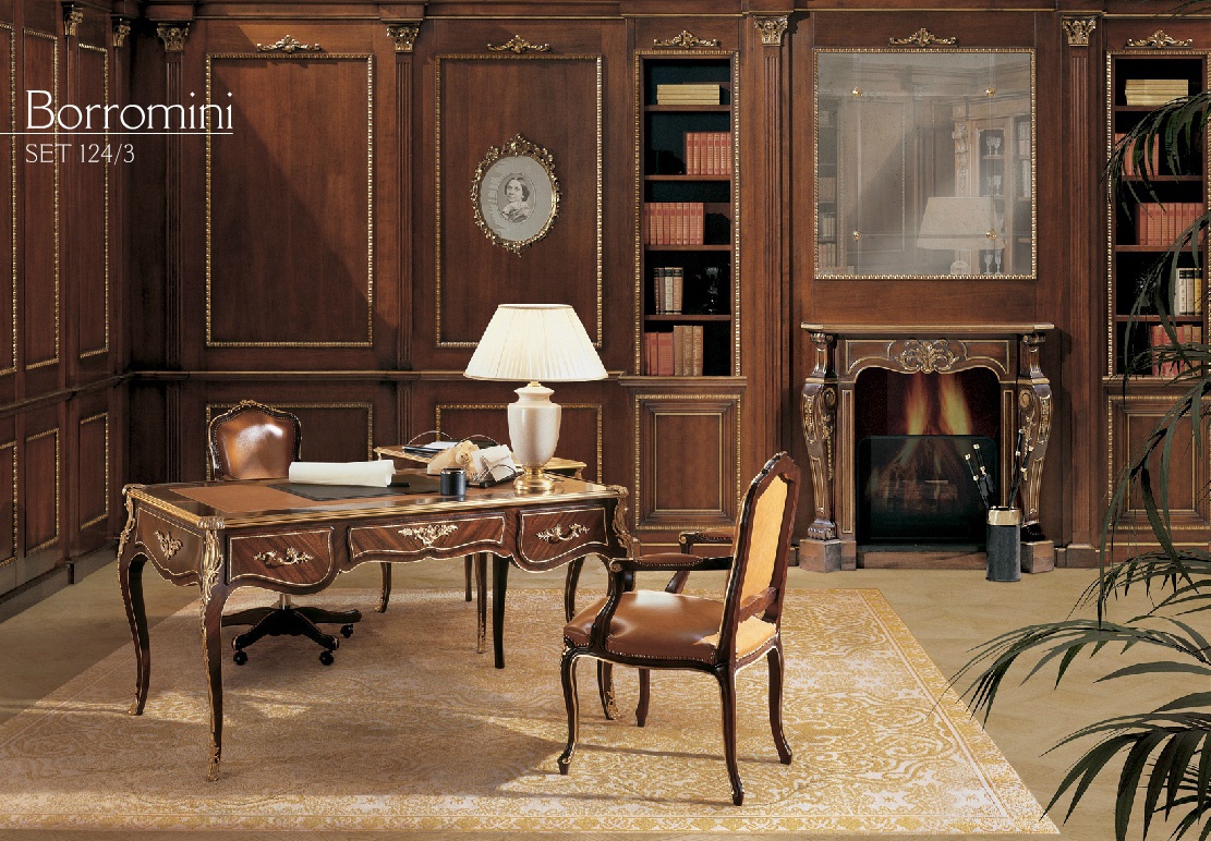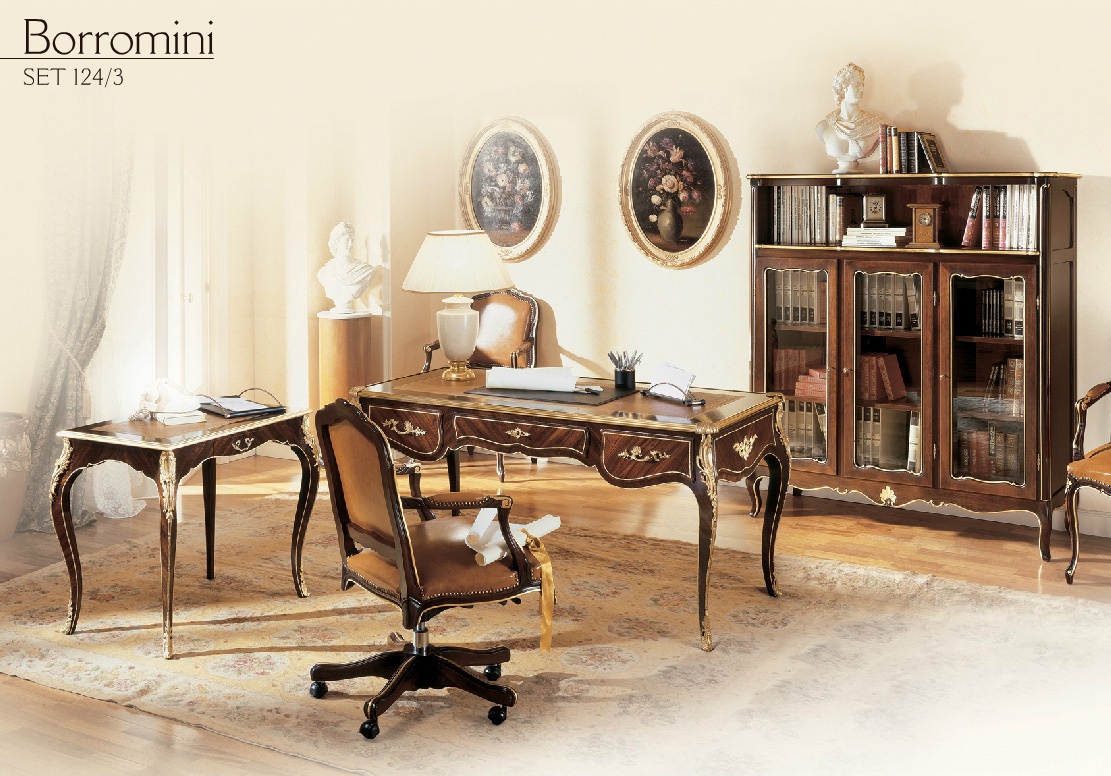Headsets for the office crowds from the Italian manufacturer Angelo Cappellini. Set includes two desks, a bookcase, a chair on wheels and chairs with armrests. Desk on curved legs with sliding drawers, and the top decorated with inlaid veneer. Swivel chair on wheels and chairs available with leather upholstery. On the arms have soft pads. Bookcase with three glass doors and one open shelf. All the items of furniture for the headset is made of wood and decorated with carved decoration with gilding. Finishing made with lacquer. Colours in stock.