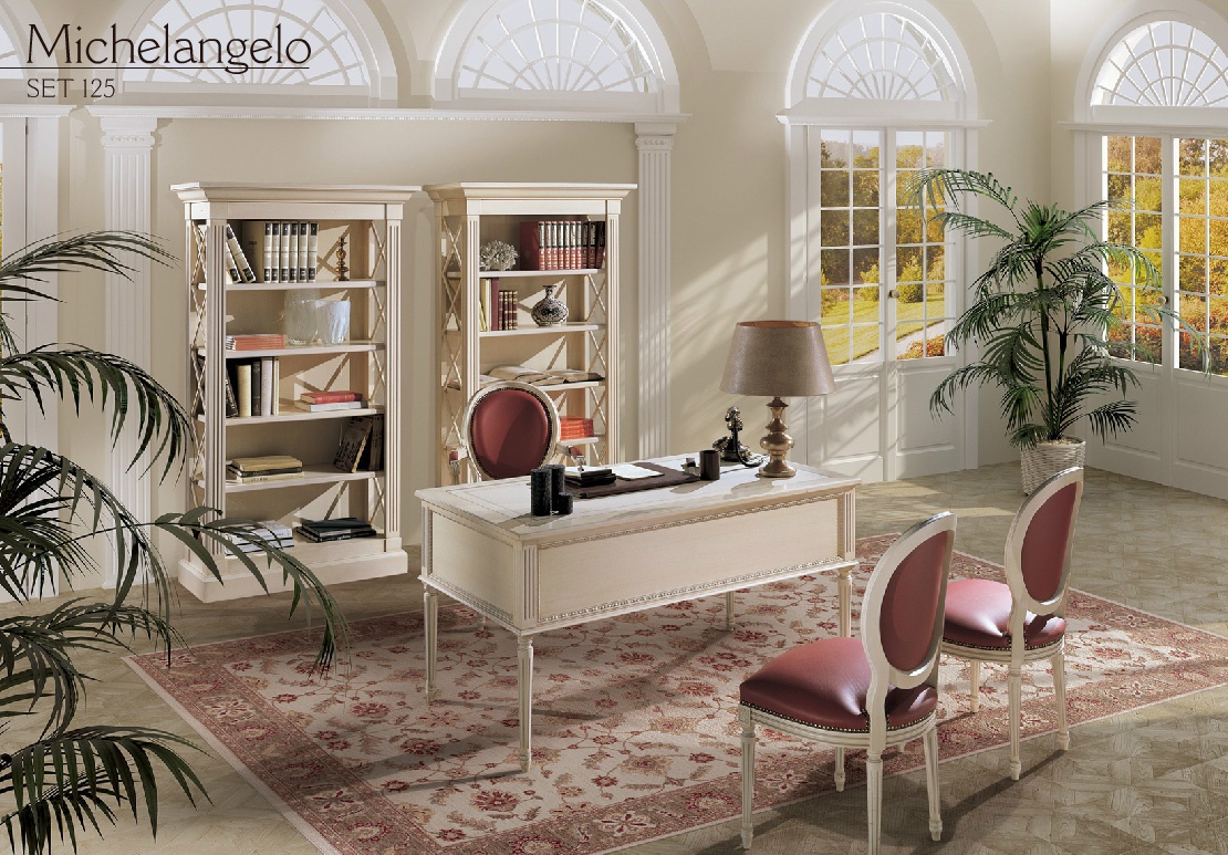 Headsets for office Michelangelo from Italian manufacturer Angelo Cappellini. Set includes Desk, bookcase and chairs with or without armrests. Writing table of rectangular form on fluted straight legs is fitted with five drawers. Two chairs without armrests and armchair upholstered in leather from the company portfolio. On the arms have soft pads. The bookcase is offered with open shelves. Furniture for the headset is made of wood. Finishes are lacquered white.