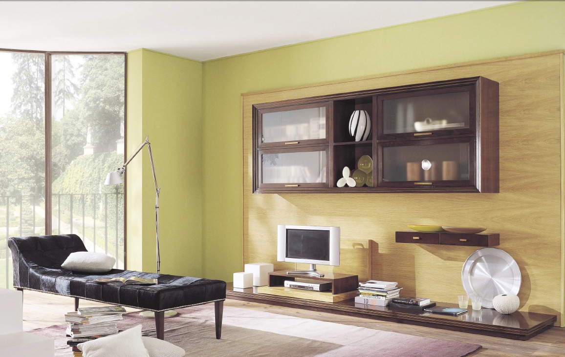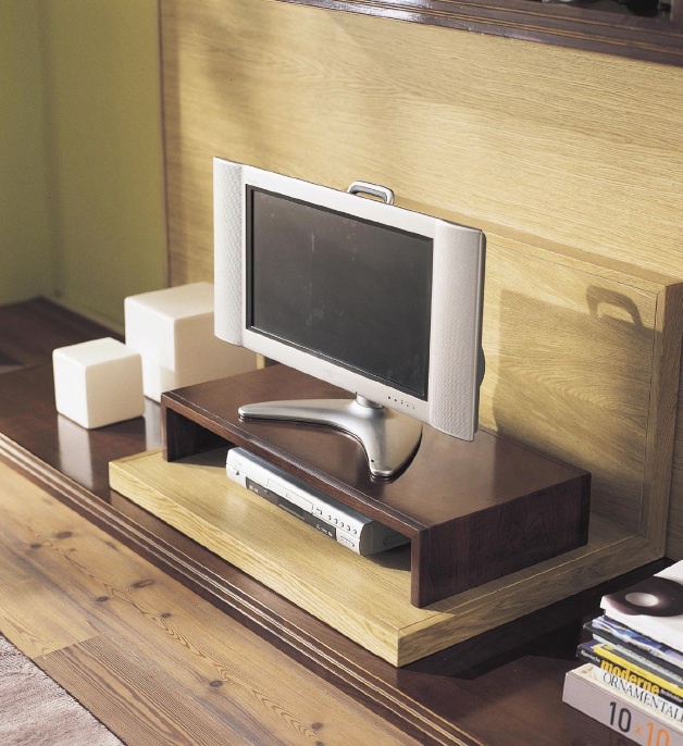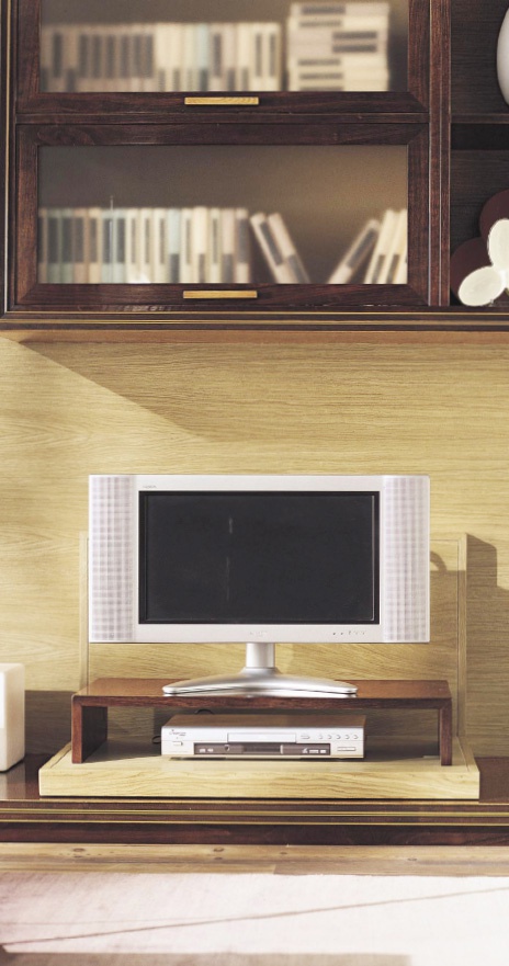 Modular system for TV Stoccolma with lockers for books Italian manufacturer Bizzotto. The furniture made from natural wood, combination of light and dark tones. There is a place to install TV, lockers for storing books and cookware with glass doors. The perfect solution for decorating interior modern living room.