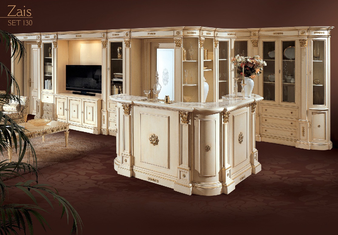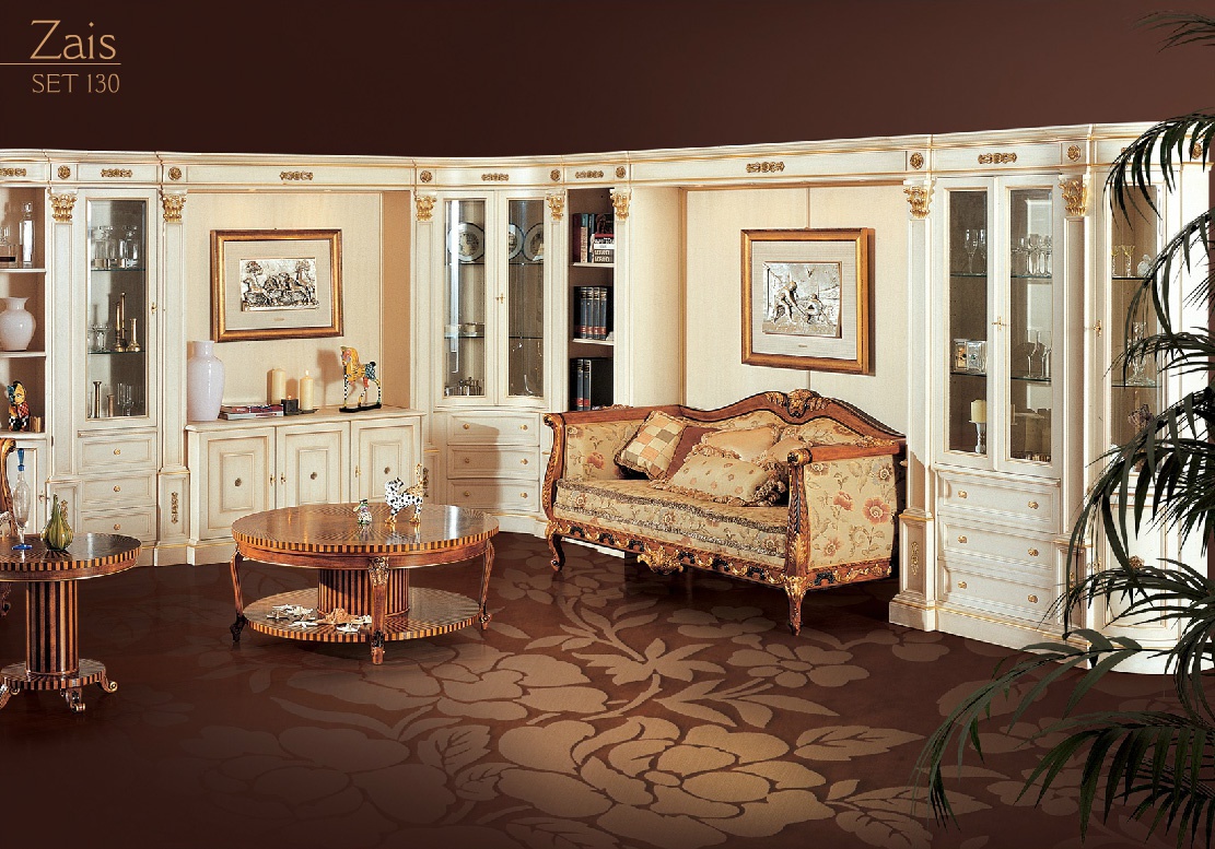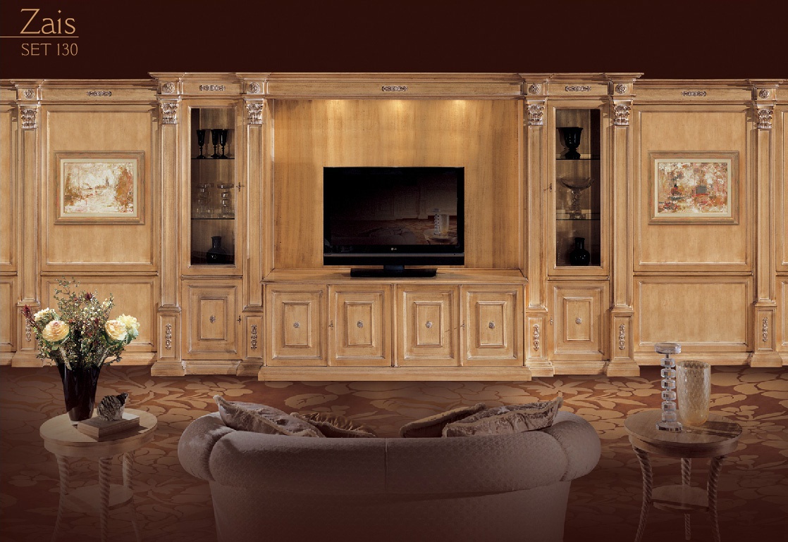 Zais modular system from Italian manufacturer Angelo Cappellini. The model includes closed and open storage shelves and drawers. The design provides space for a TV, bookcase, cupboard. The body is made of wood. Finishing made with lacquer. Door panels are available solid and glazed. Accessories metal. The modular system is made in a classic style.