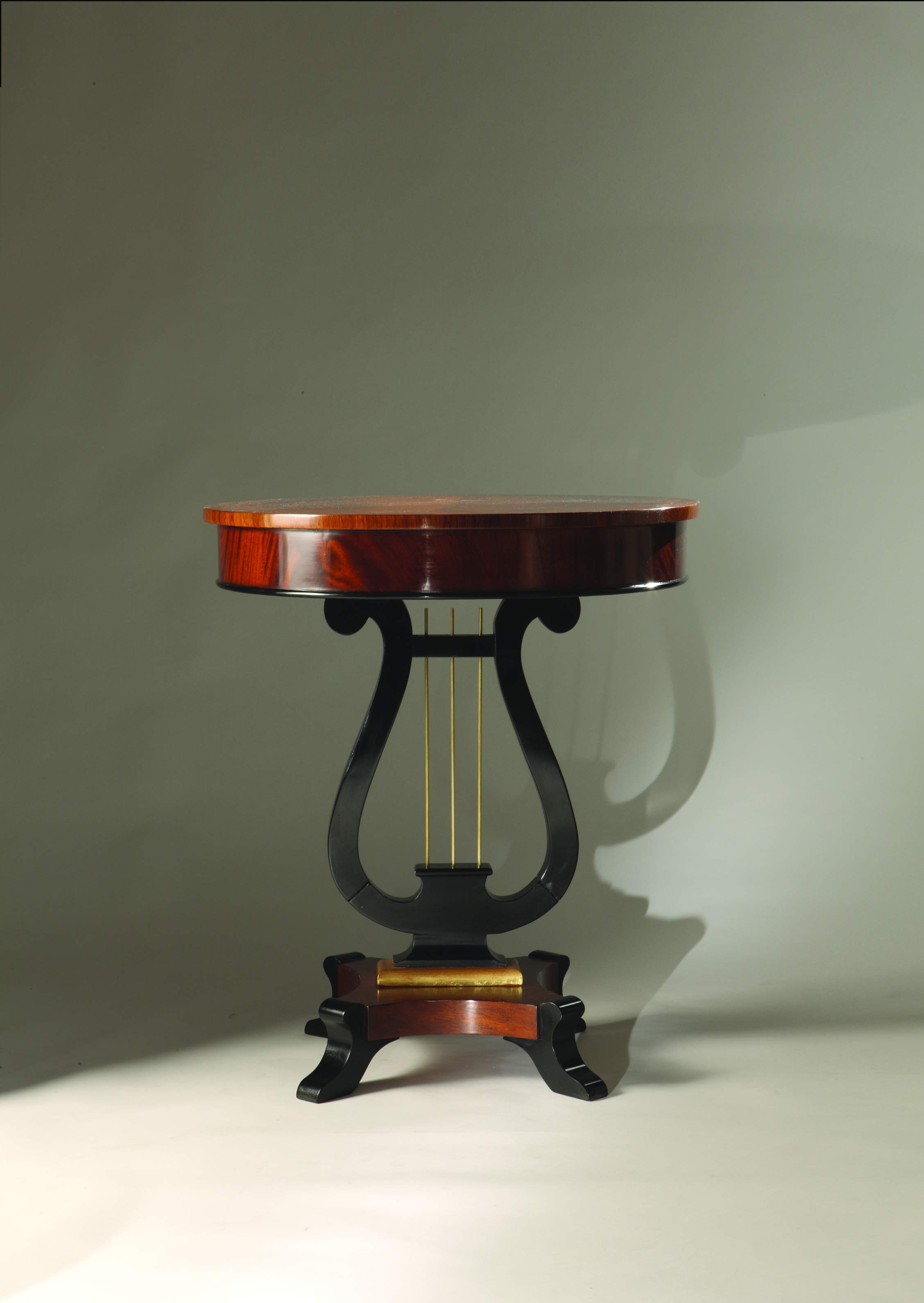 Sandra Rossi coffee table from Italian manufacturer Colombo Stile. Table in Empire style mahogany with "flame". Finish: patina gummies with "extra Antiques" foil
