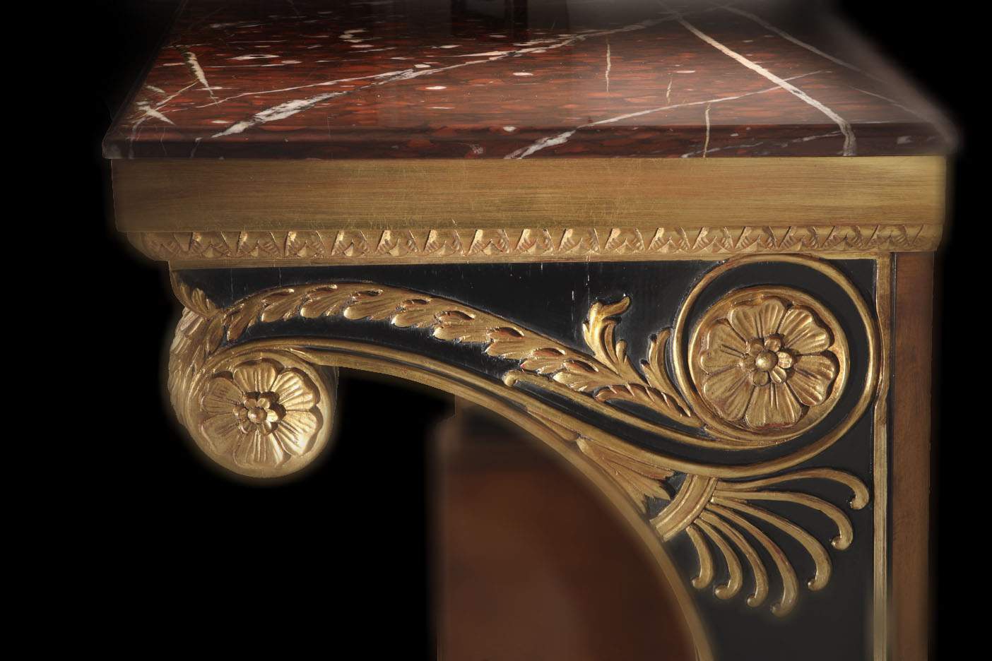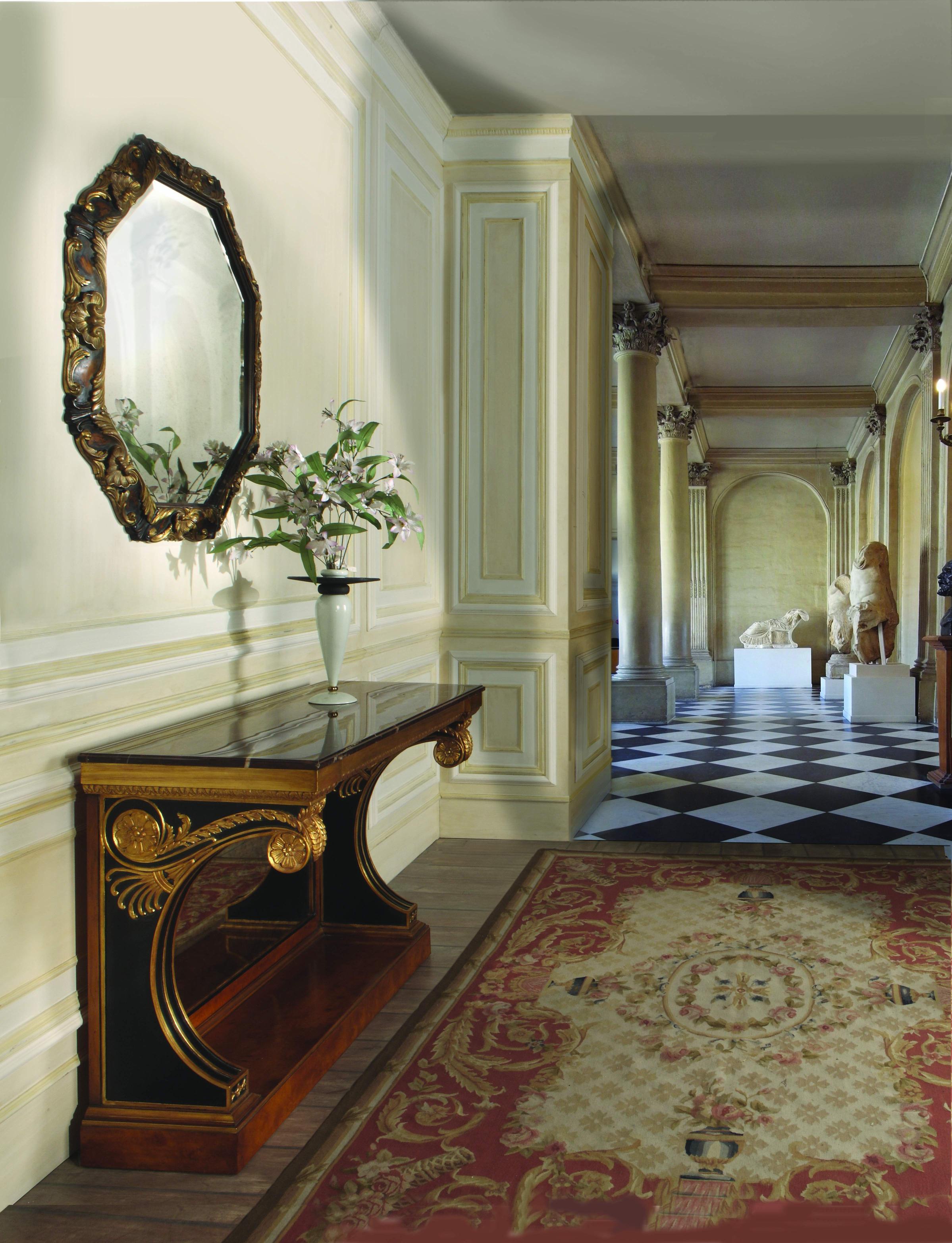 Console by Sandra Rossi from Italian manufacturer Colombo Stile. The console in neoclassical style, the root of Myrtle tree. Carving handmade by natural wood. Polished with patina "extra Antiques", details in gold foil. Marble top "rouge de roi" thick.