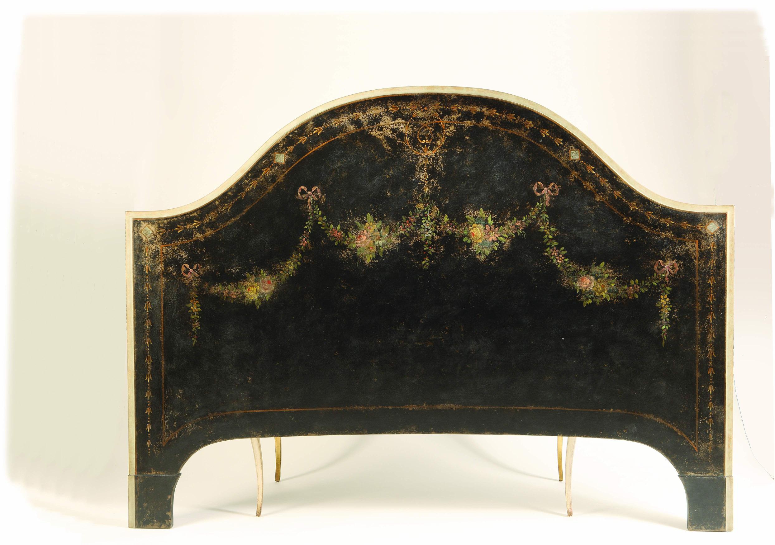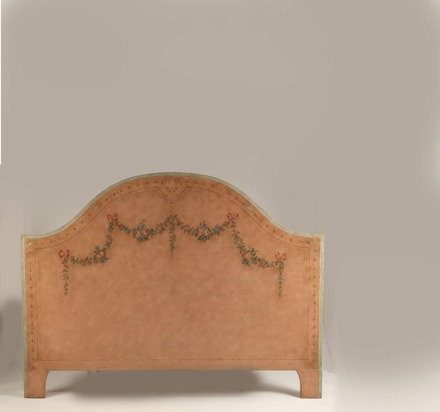 Double bed with high headboard Sandra Rossi from Italian manufacturer Colombo Stile. Headboard with hand painting. Tempera varnish finish with patina "extra Antiques". Colours in stock.