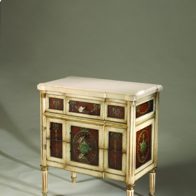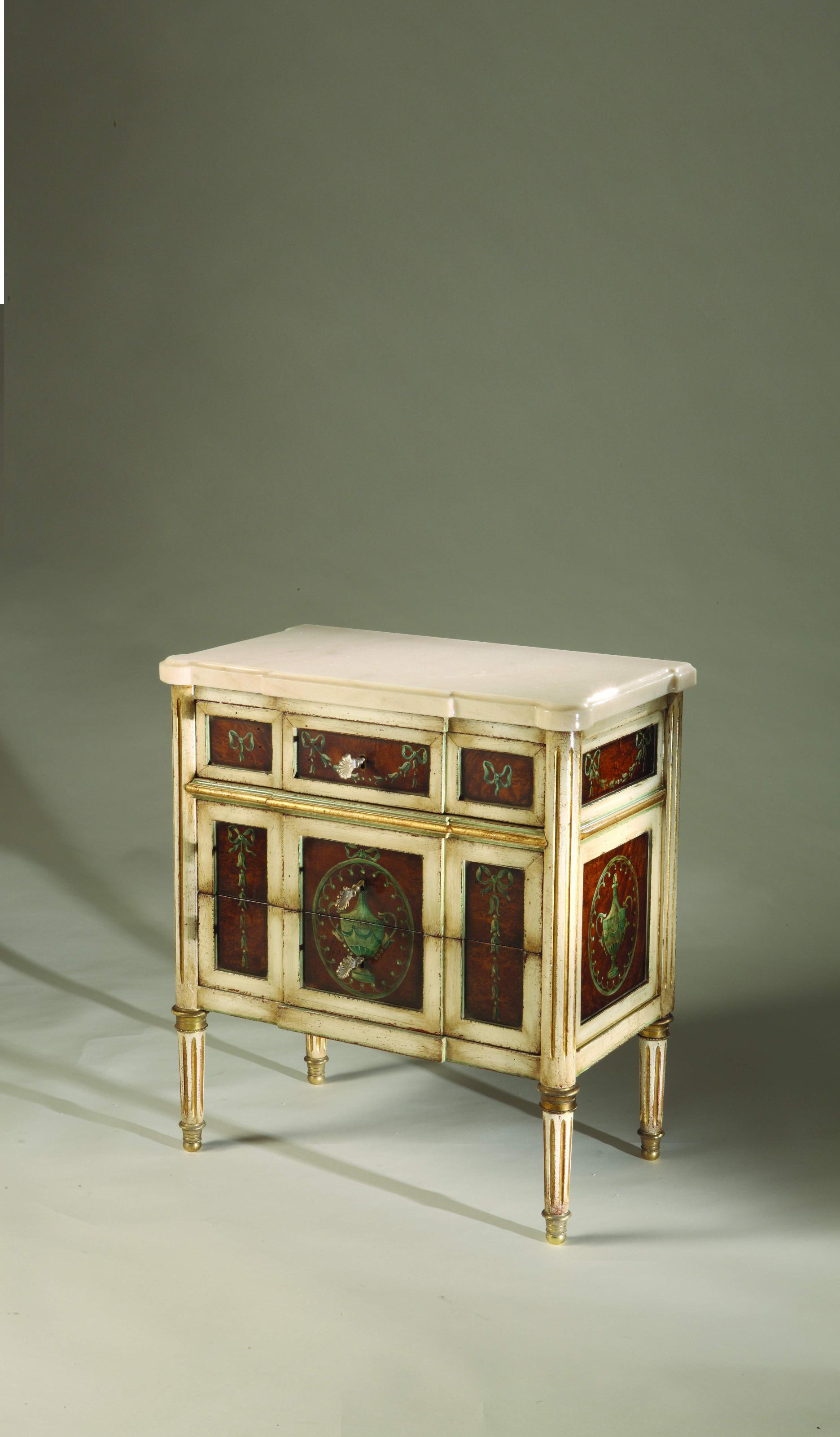 Bedside table Sandra Rossi from Italian manufacturer Colombo Stile. Bedside table in the Louis XVI style the root of the Myrtle tree. Varnishing and polishing with patina "extra Antiques". Painting and bronze details. Marble "fiore di pesco" thick. 30 mm colors back in stock.