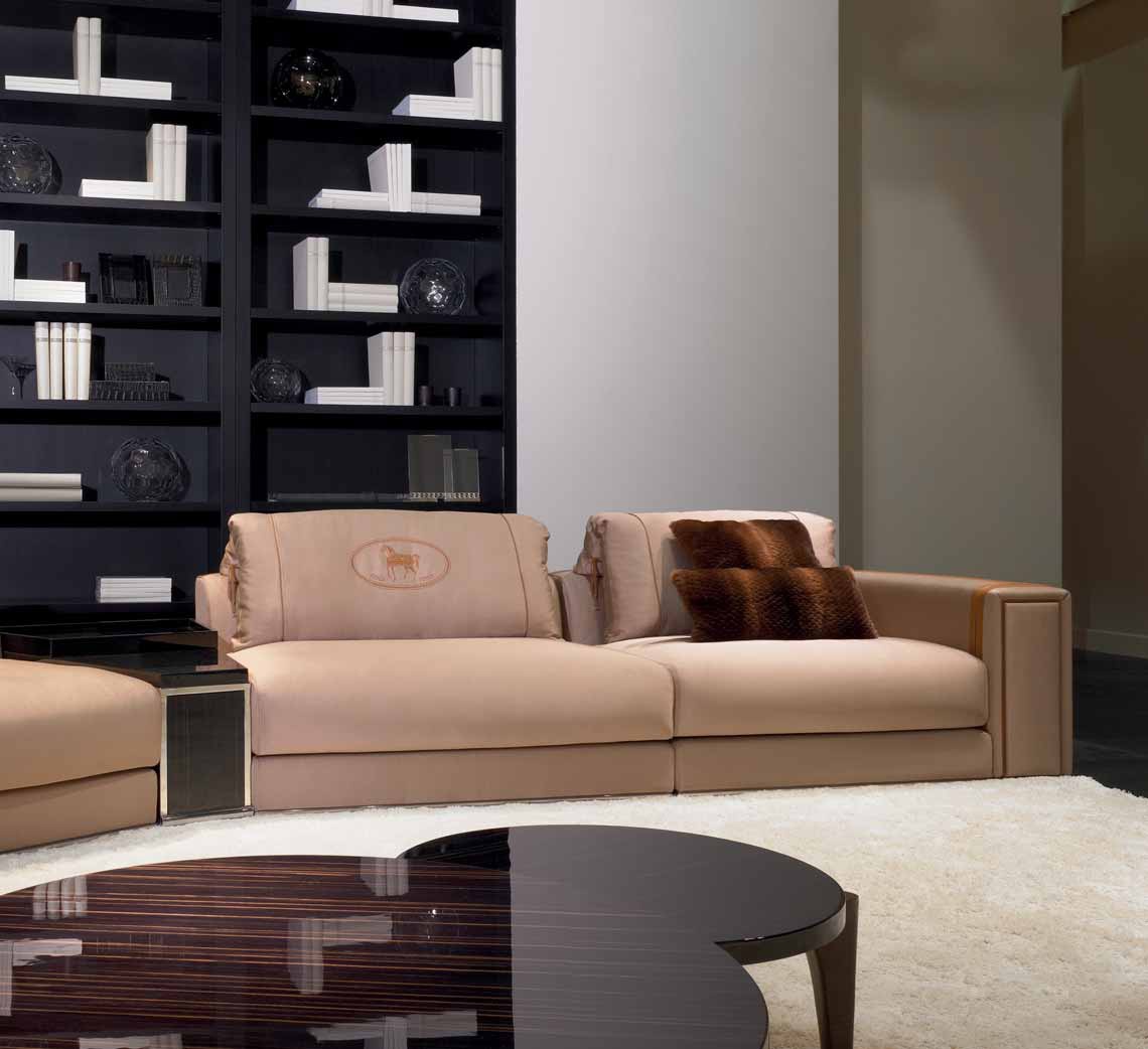 Premiere modular sofa with a coffee table Raffles from the Italian manufacturer Fendi. The base is made from chromed metal and wood. Upholstery - leather or textiles from a range of companies. The model is designed for living room in modern style. Filling - polyurethane foam. Pillow: feather. The design of complementary decorative pillows. Coffee table - wood, varnished. Colours in stock.