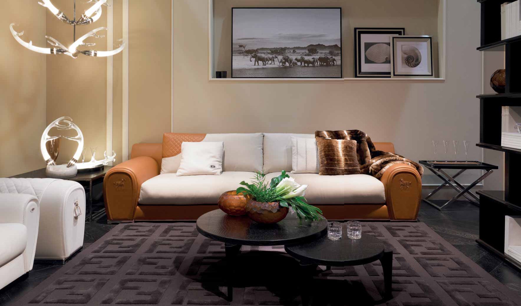 Quadruple Varenne sofa from Italian manufacturer Fendi. The base is made from chromed metal and wood. Upholstery - leather or textile from the company portfolio, the corners are quilted. The armrests are decorated with embroidery. The model is designed for living room in modern style. Filler - polyurethane. Cushions: feather and polyurethane. Colours in stock.