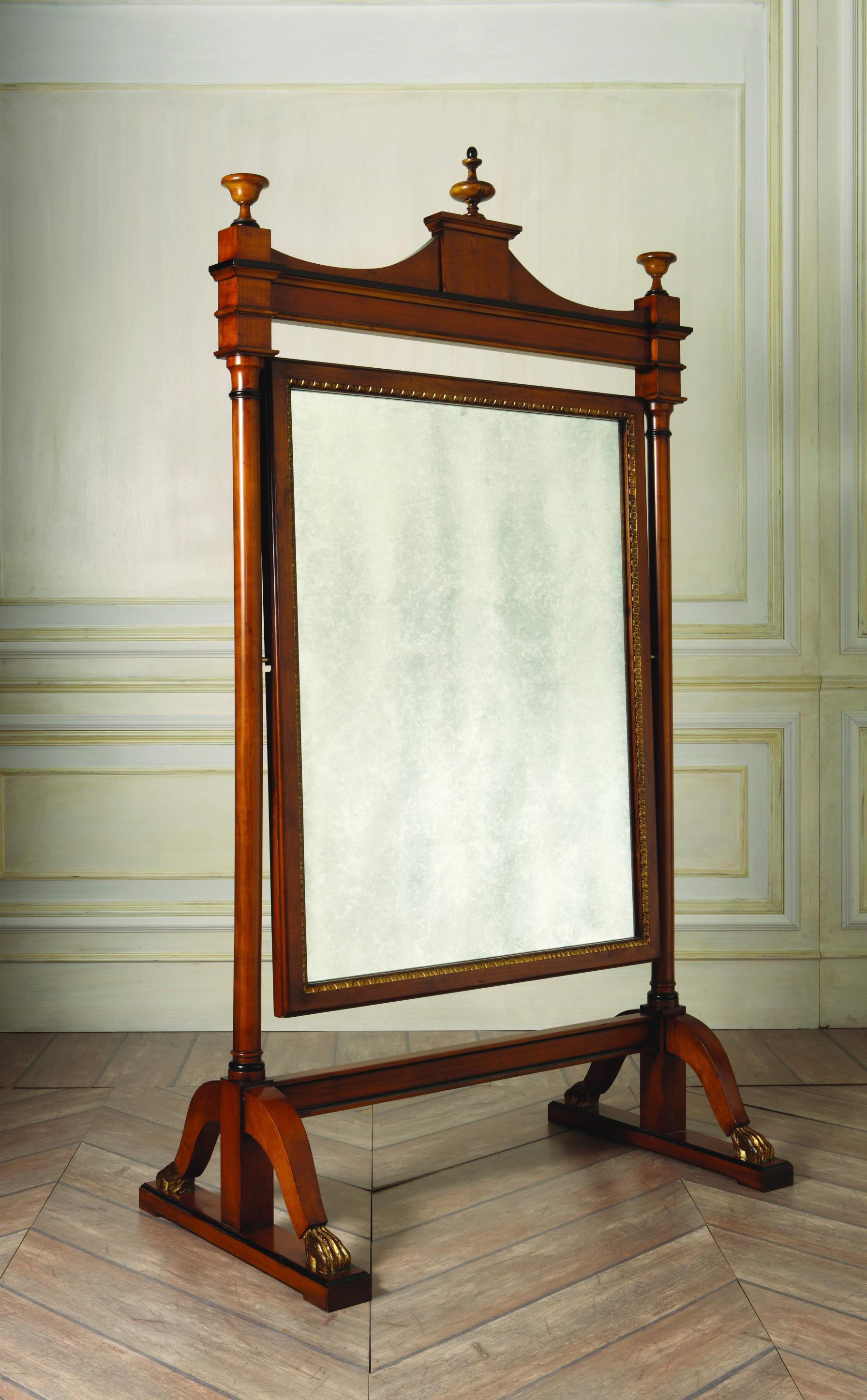 Outdoor mirror Sandra Rossi from Italian manufacturer Colombo Stile. Floor standing mirror in a classic style. With adjustable tilt mirror antique cherry wood. Carving handmade by natural wood. Finish: Gumrak and aged patina. Details in patinated gold leaf. Colours in stock.