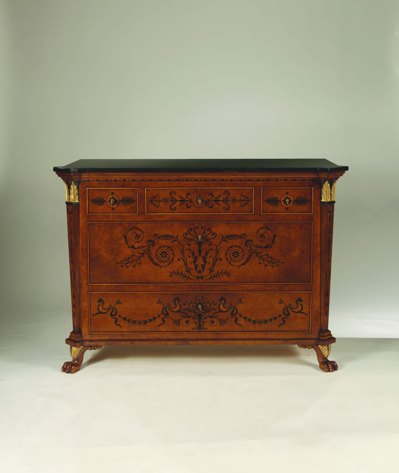 Dresser Sandra Rossi from Italian manufacturer Colombo Stile. Chest of drawers in classic style with 5 drawers. The root of the Myrtle, with inlay. Finish: gummies with patina, gold leaf. Countertop black marble “nero marquina" thick. 20. colors in stock.