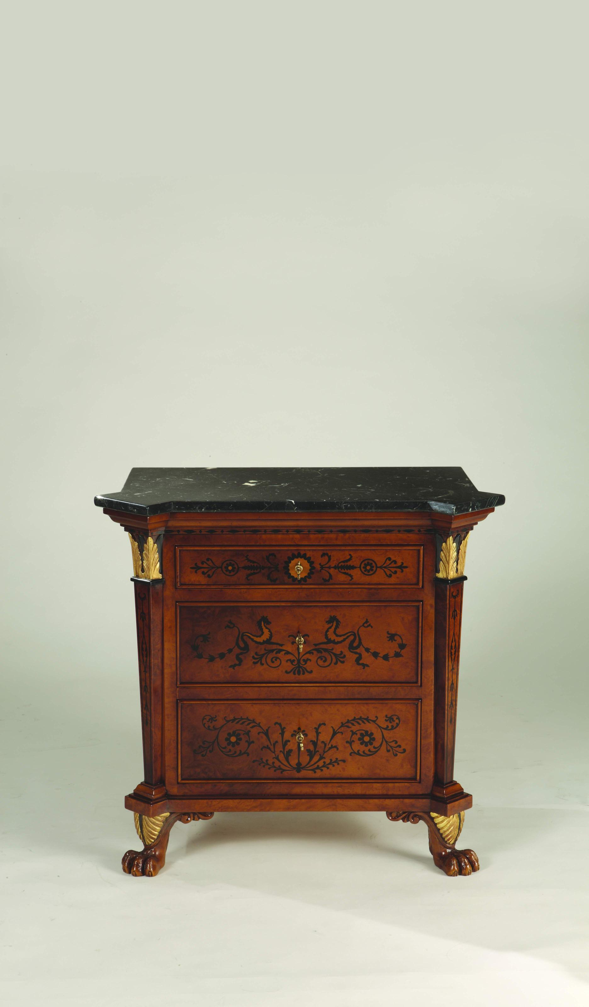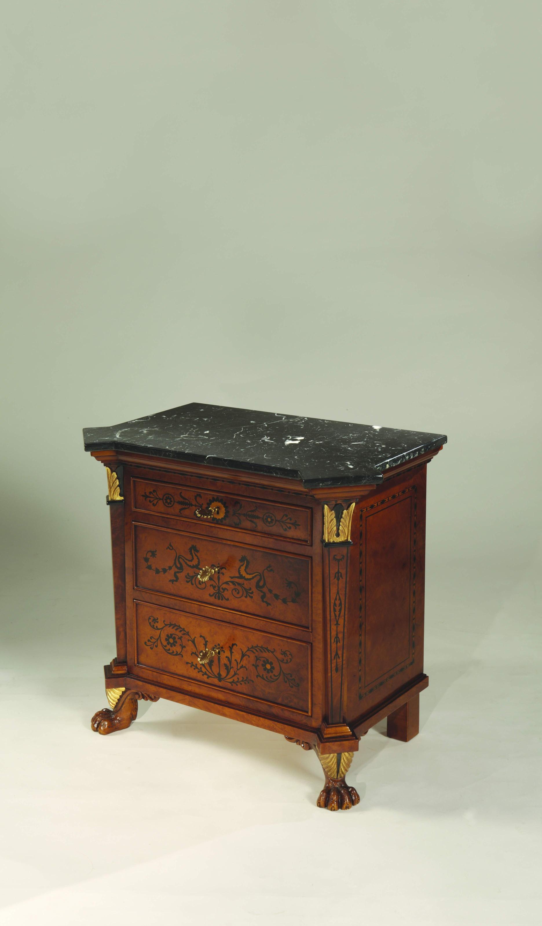 Bedside Cabinet Sandra Rossi from Italian manufacturer Colombo Stile. Nightstand in classic design with 3 drawers. The root of the Myrtle, with inlay. Finish: gummies with patina, gold leaf and stain.