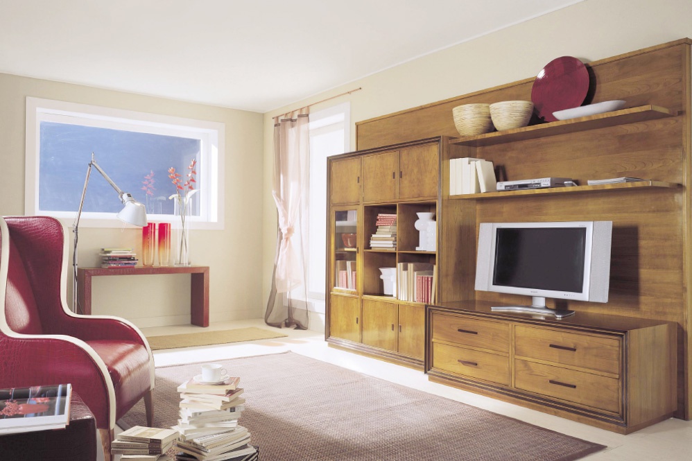 The wall to store books Stoccolma Italian manufacturer Bizzotto. Furniture with wall panel made from natural wood, combination of light and dark tones. There is a place to install TV, lockers for storing books and crockery with a glass door, drawers, and open modules. The perfect solution for the decor of interior classic living room.