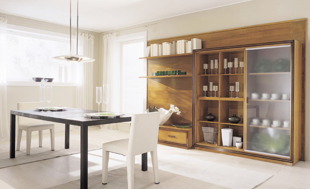 Wall storage utensils Stoccolma Italian manufacturer Bizzotto. Furniture with wall panel made from natural wood, combination of light and dark tones. A locker with a sliding door of frosted glass, shelves to store books and drawers. The perfect solution for decorating interior living room.