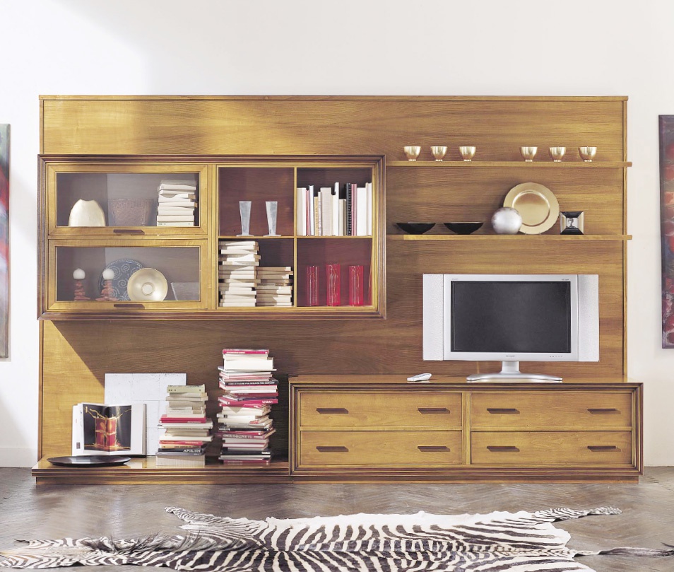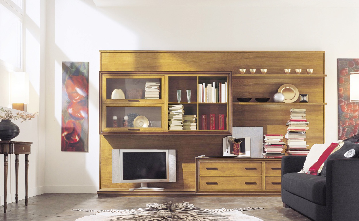 Modular system for TV Stoccolma Italian manufacturer Bizzotto. Furniture from natural light tones of wood. There is a place to install TV, lockers with hinged doors to store books and dishes. Doors with glass tops. Equipped with drawers and open shelves.