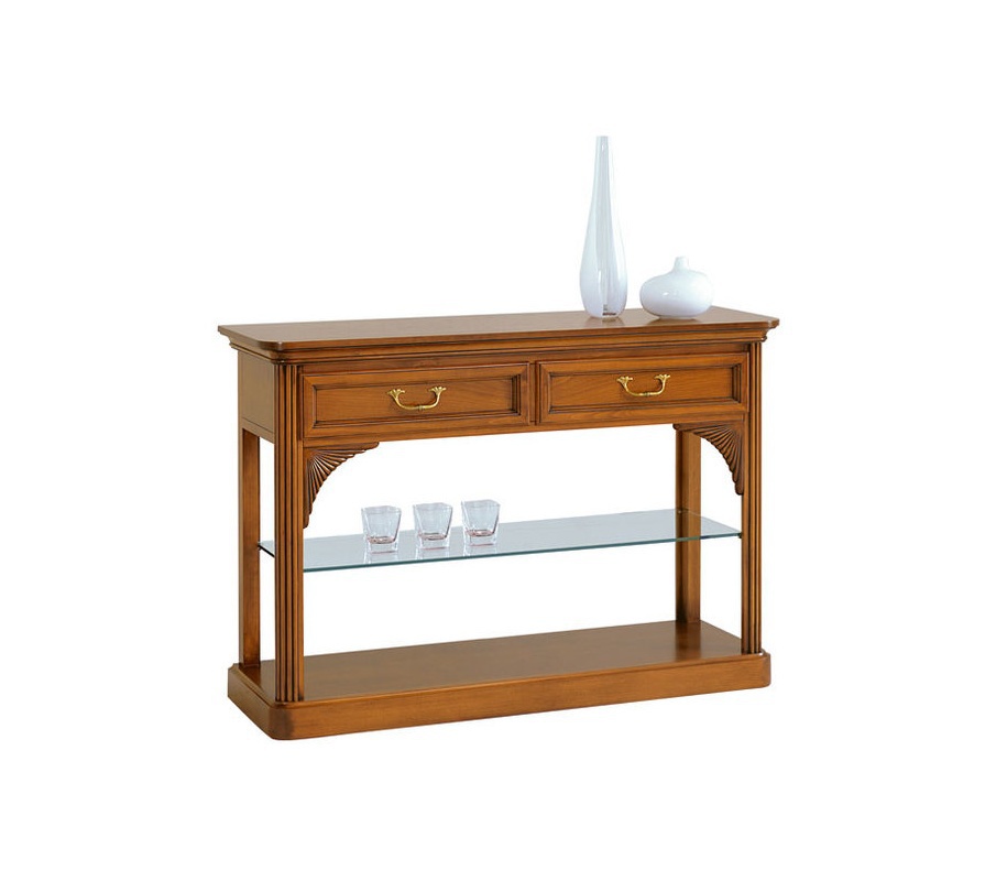 Console with two drawers and removable glass shelf, Selva. The model is varnished. The basis of a frame made of solid wood. The furniture is produced in a classic style. Product color natural wood.