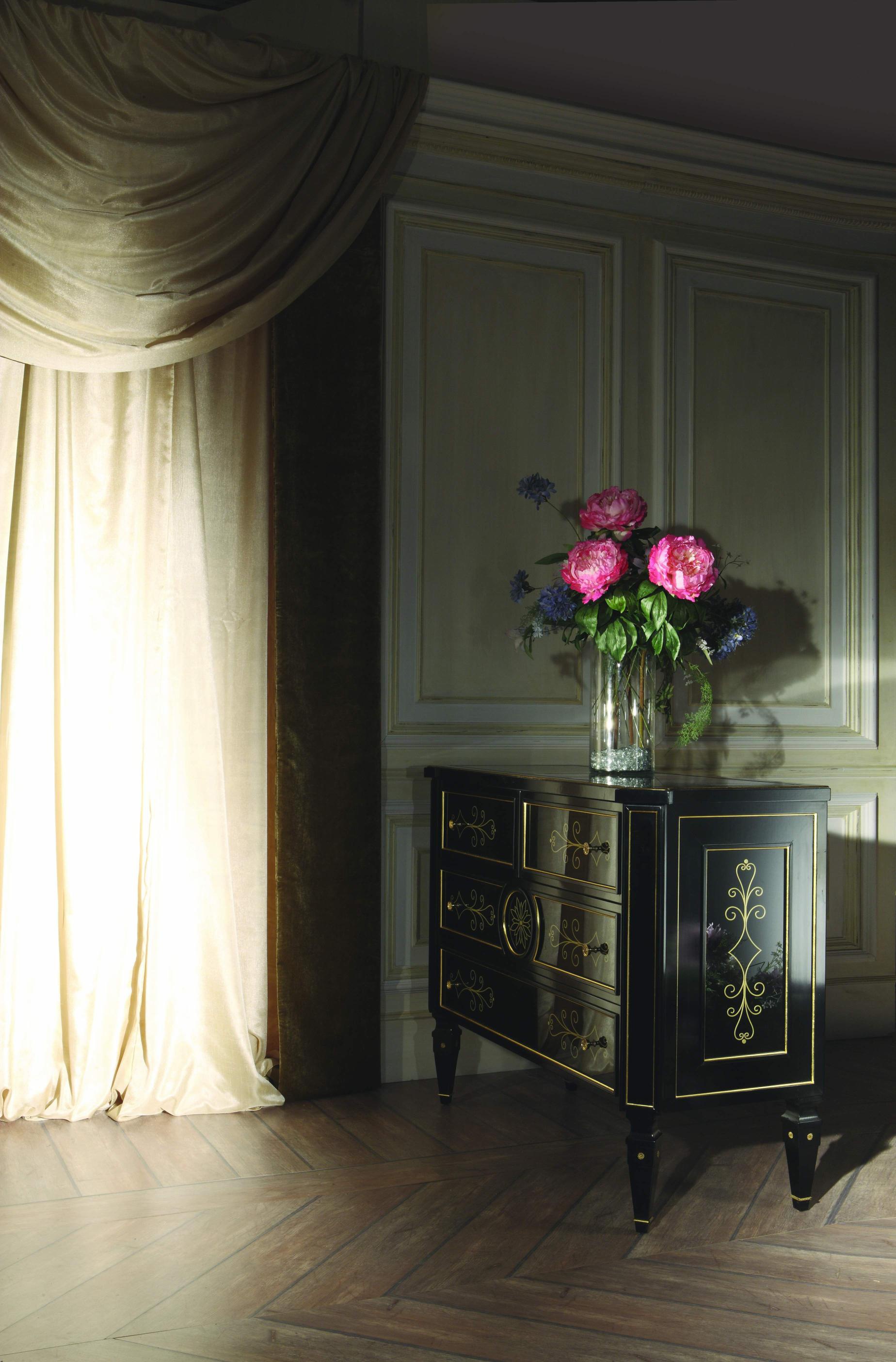 Dresser Sandra Rossi from Italian manufacturer Colombo Stile. Commode style Charles X design wood blackened. Insert black glass with engraved patterns and gold trim. Finish: gummies with details in gold foil. Colours in stock.