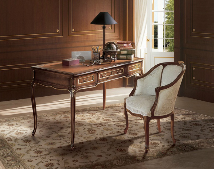 Desk Vivaldi from the Italian manufacturer Angelo Cappellini. Elegant model on curved legs with three drawers. Frame and table top made of natural wood. The design is complemented with carving and gilding.