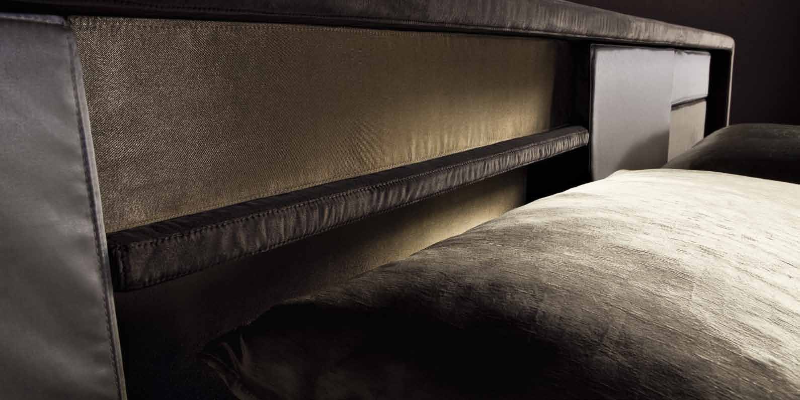 Double bed Rauni from the Italian manufacturer of design furniture JC Passion is made in art Deco style, from the collection of Chocolat. The frame is made from laminated poplar wood. Headboard and bed base are composed of rectangular elements of different sizes and in different upholstery. Upholstery - textiles from the company portfolio. Colours in stock. The perfect solution for your bedroom.