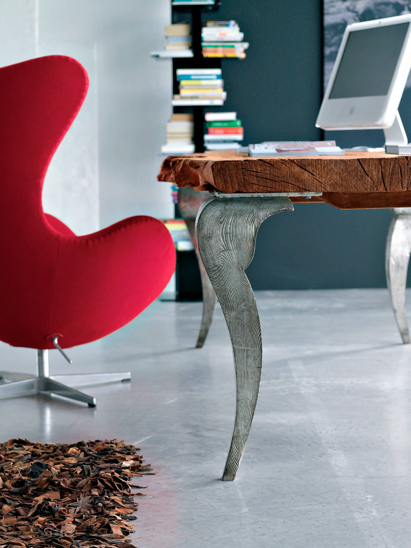 Desk Office Design Italian manufacturer Bizzotto. Table of basal wood (radiaca), 200 year old trees. This tree is unique as it occurs in specific environmental conditions, such as floods, landslides, and therefore each product from the "radica" by their unique sizes and shapes. Legs are made of wood, covered with silver paint. Design solution for the modern interior of the Cabinet.