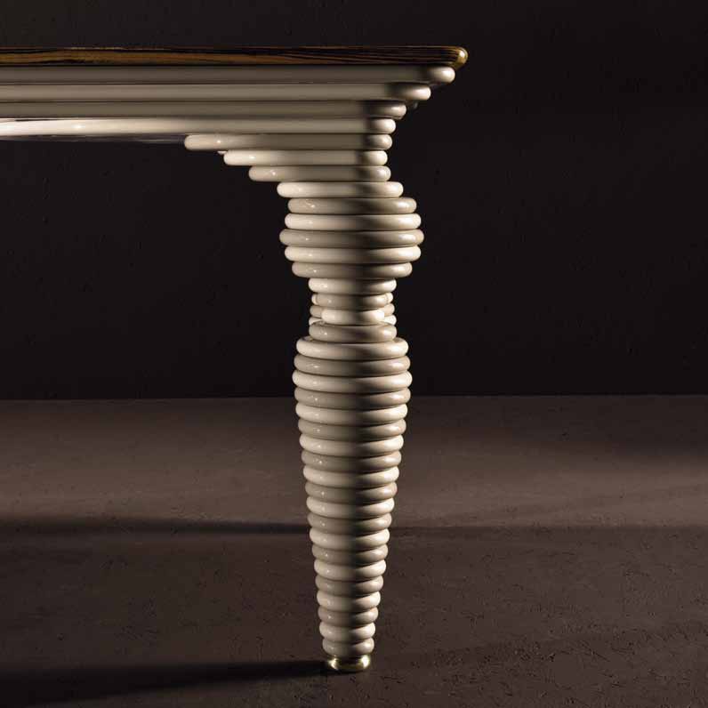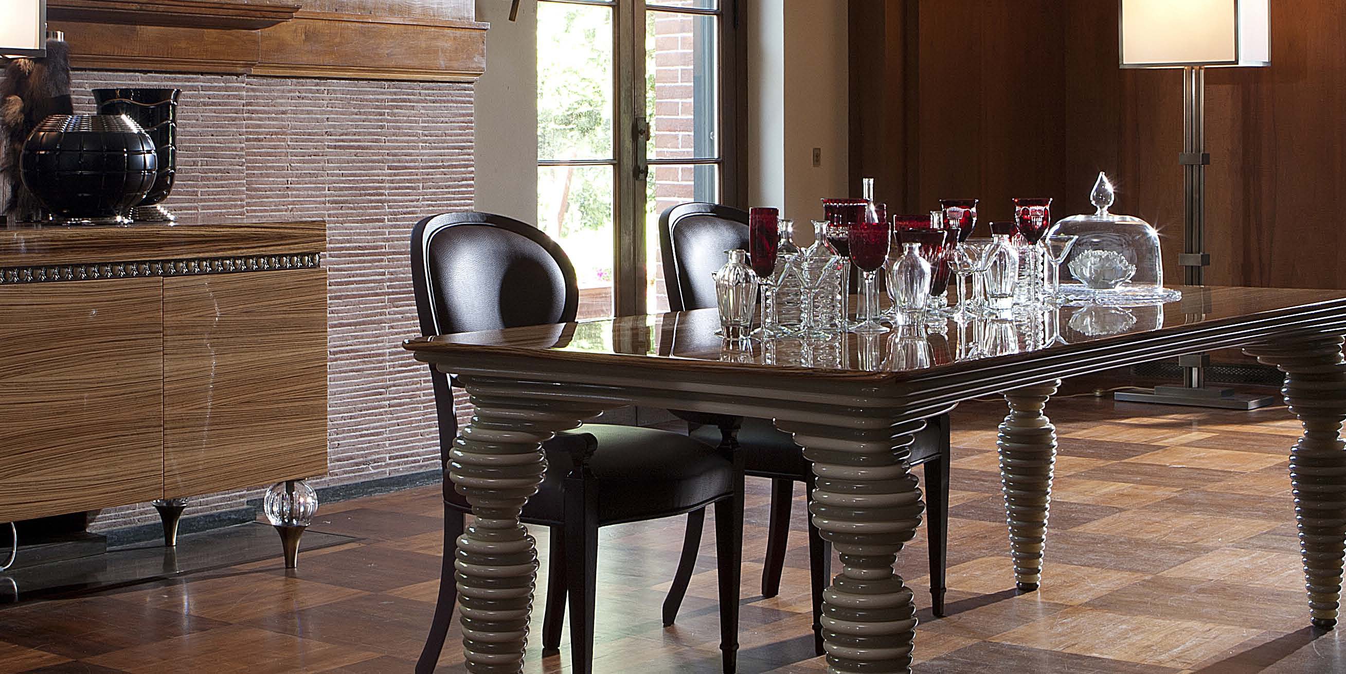 Dining table Venice from the Italian manufacturer of design furniture JC Passion in the art Deco style. Collection Chocolat. The table is made from natural wood, finished with lacquer from a range of companies. Legs covered with eco leather and methacrylic opalescence. Colours in stock.