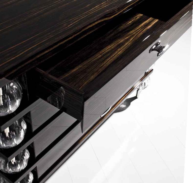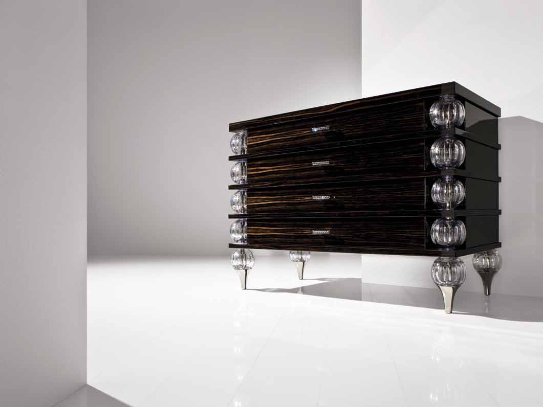 Chest Sfera by Italian manufacturer of designer furniture JC Passion in the art Deco style. Collection Chocolat. A model of natural ebony wood, finish - the lacquer from the company portfolio. Legs Nickel-plated steel. Design complete balls and crystal knobs from Swarovski crystals. Colours in stock.