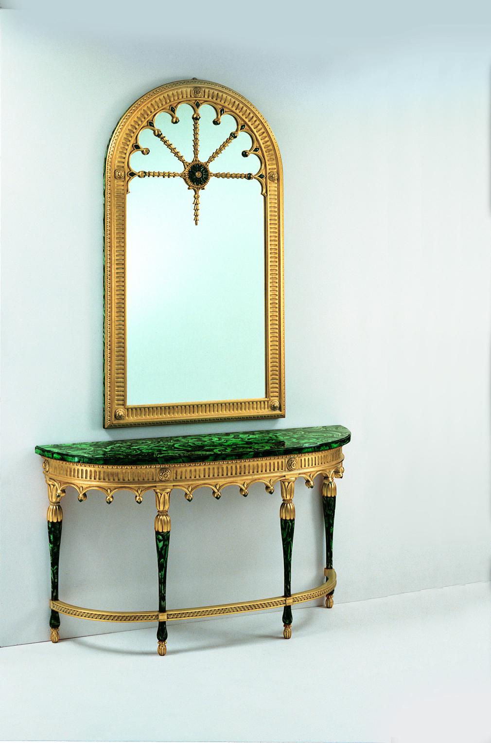 Console S. I. P. ARR 09 from Italian manufacturer Colombo Stile. The frame is natural wood. Finish: gold leaf and lacquer imitation of malachite. Decorative elements of handwork. Elegant and stylish element of classic interior.