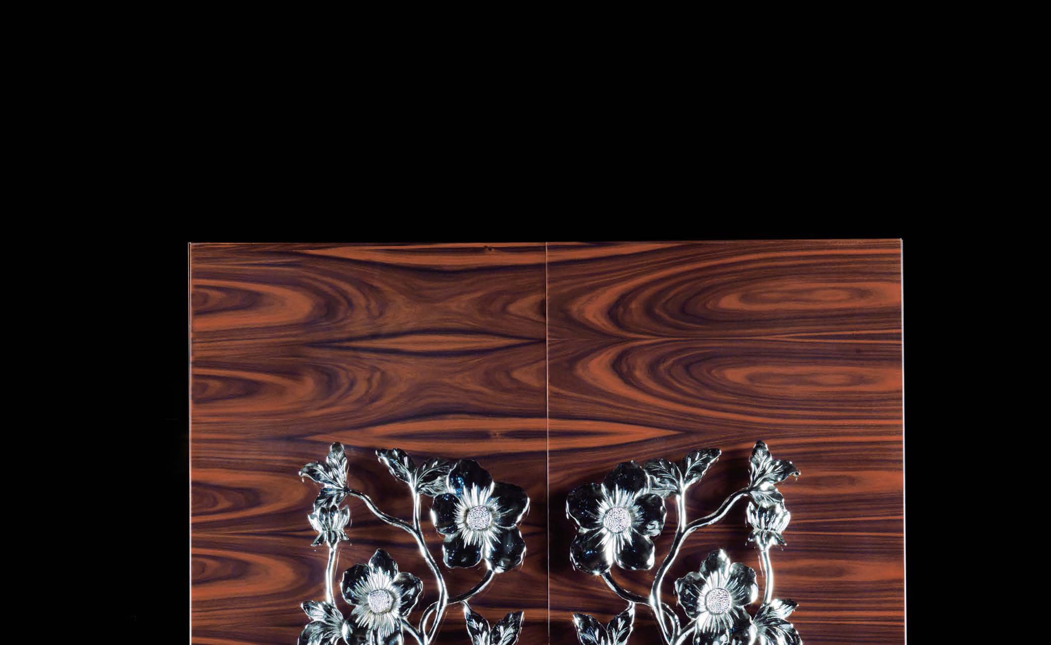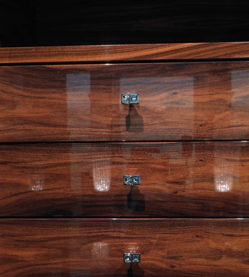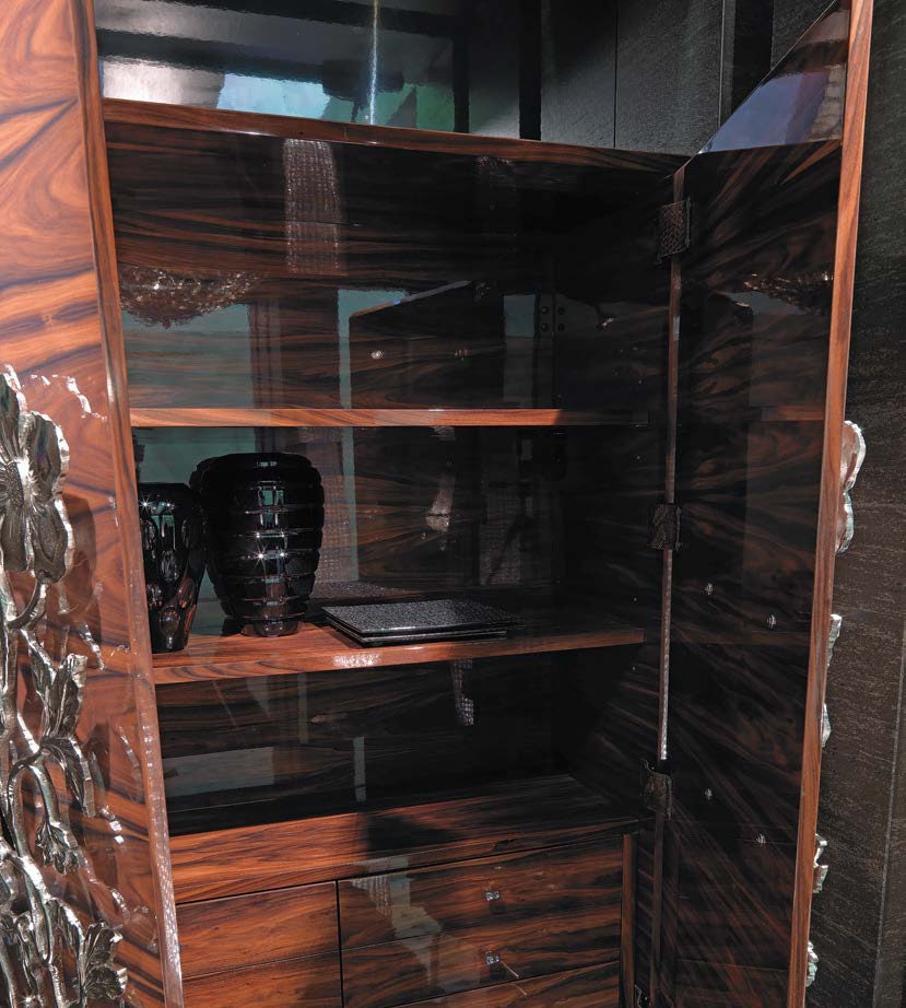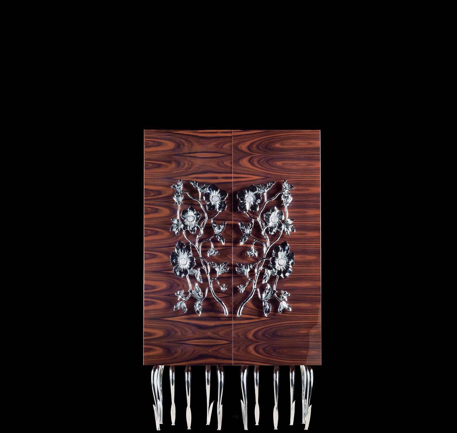Wardrobe Flower from Italian manufacturer of design furniture JC Passion, made in the style of art Deco. Housing of solid rosewood, inside there are two shelves made of rosewood. Legs Nickel-plated brass, finish to client's request. Finish - Matt or glossy lacquer, from the company portfolio. Collection Gold. Colours in stock.