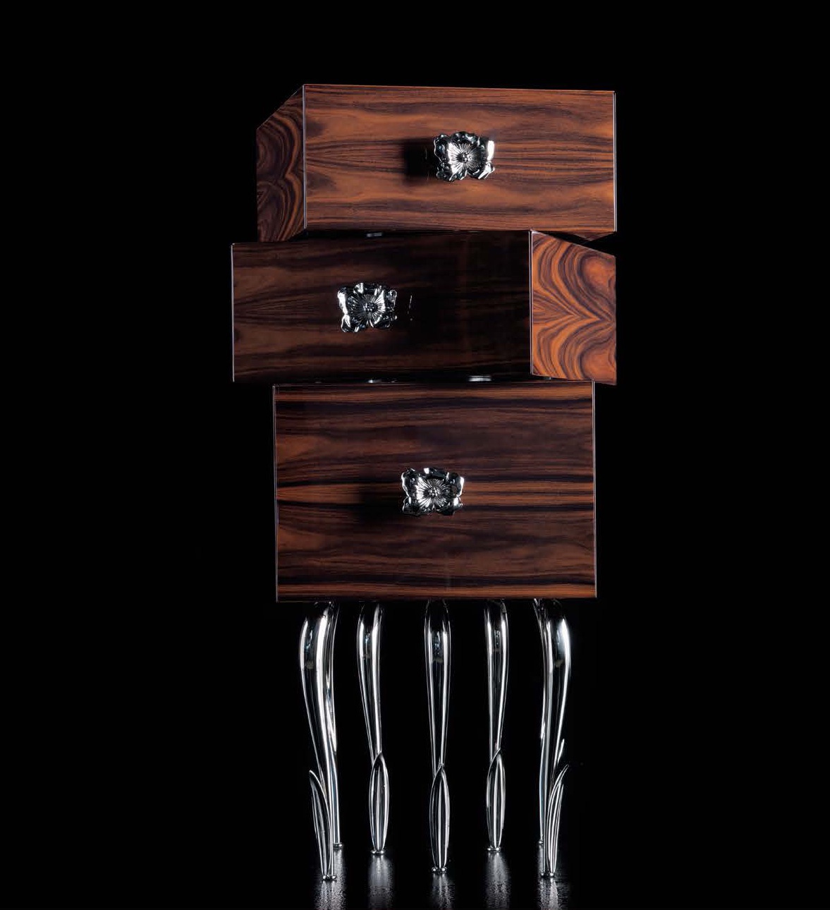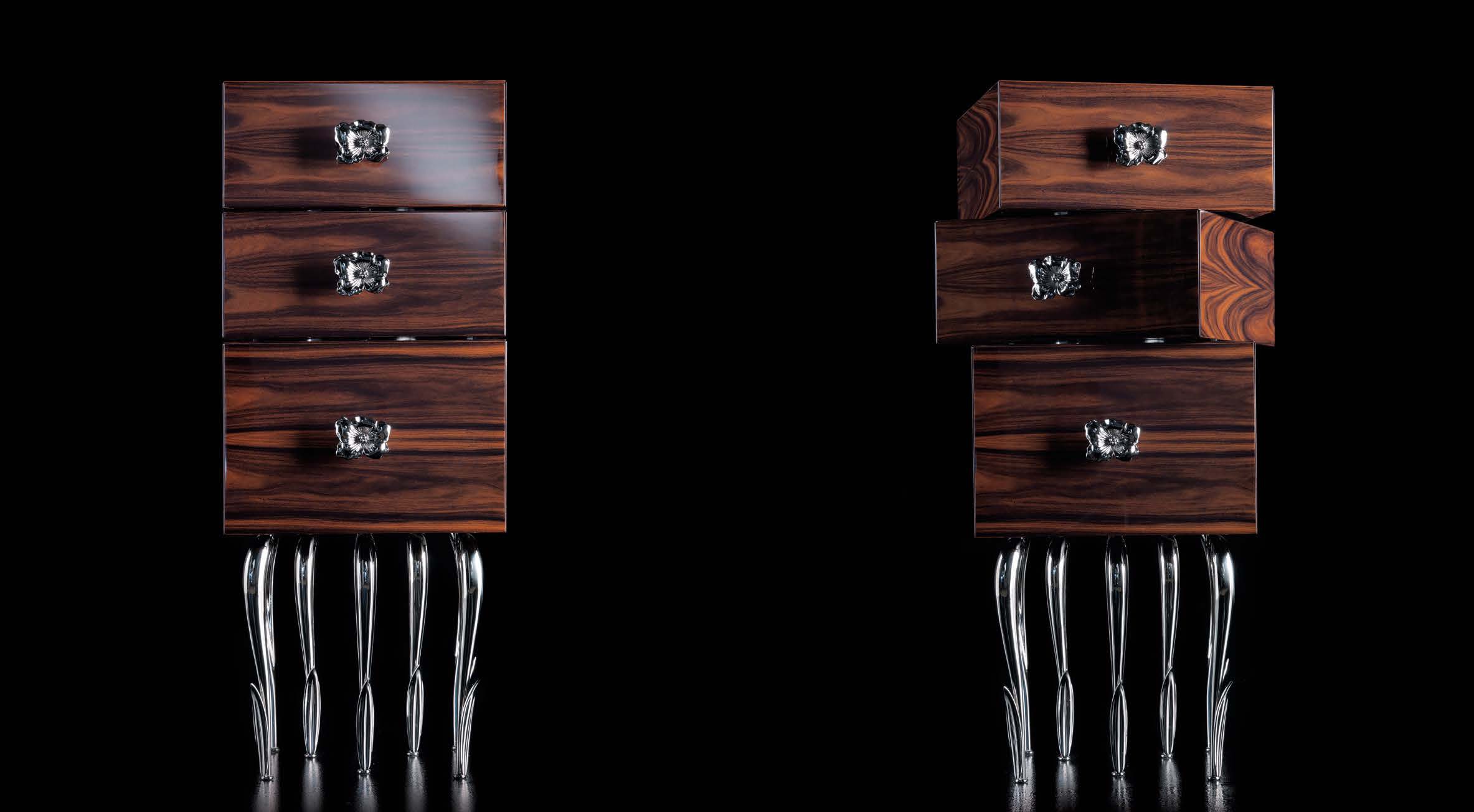 The Flower of drawers from Italian manufacturer of design furniture JC Passion, made in the style of art Deco. The body is made from solid rosewood. The legs are made of Nickel-plated brass. Finish - Matt or glossy lacquer, from the company portfolio. Collection Gold. Colours in stock.