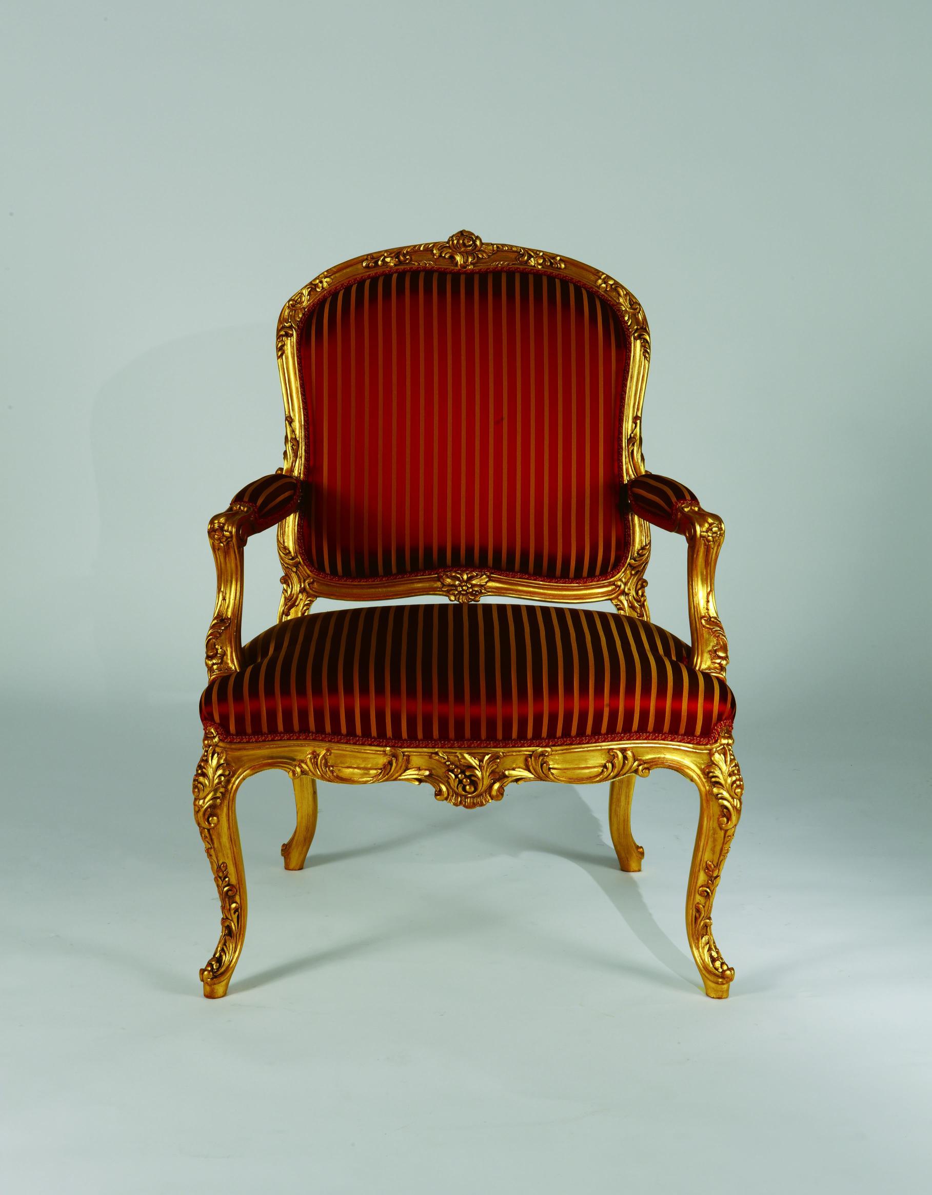 Chair with armrests S. I. P. ARR 09 from Italian manufacturer Colombo Stile. Chair in the style of Louis XV. Finish: gold leaf with patina. Decorative elements of handwork. The model is made in classic style. Colours in stock.