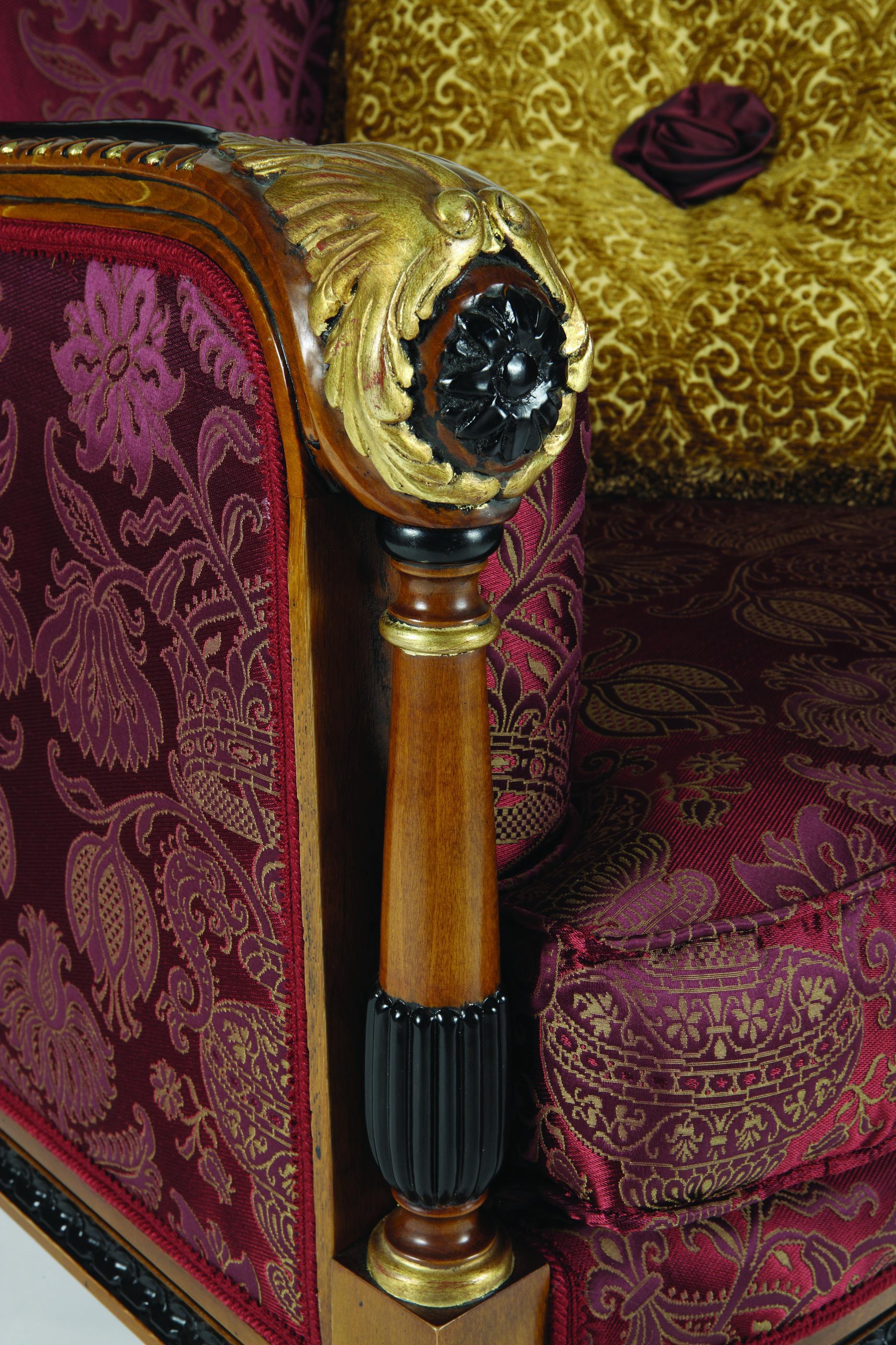 Chair S. I. P. ARR 09 from Italian manufacturer Colombo Stile. Model for the living room in the style of Louis XVI. Finish: polished walnut with schemename, with gold leaf patina. Upholstery - textiles. Colours in stock.