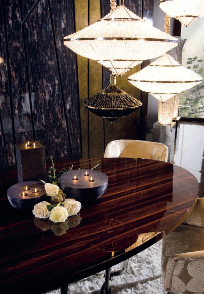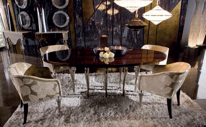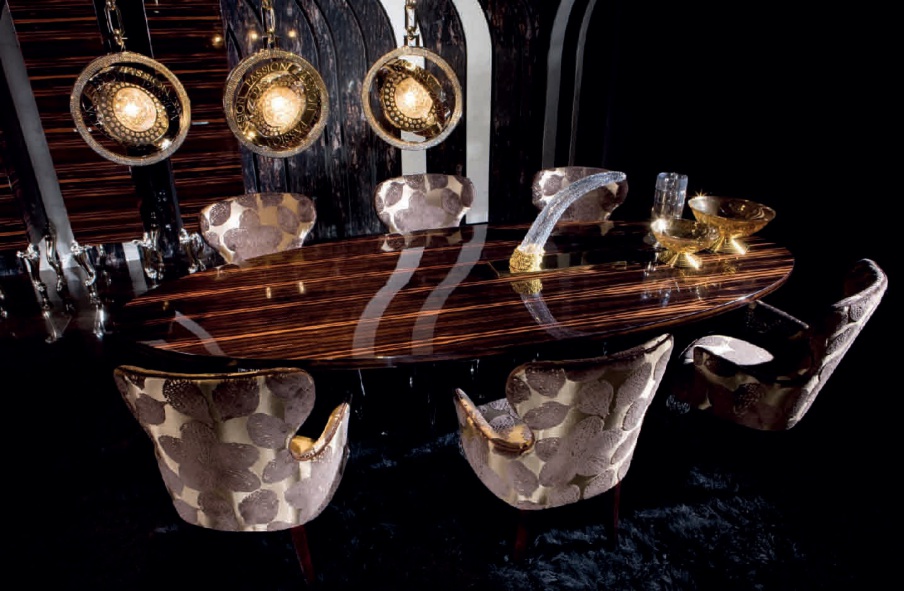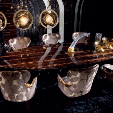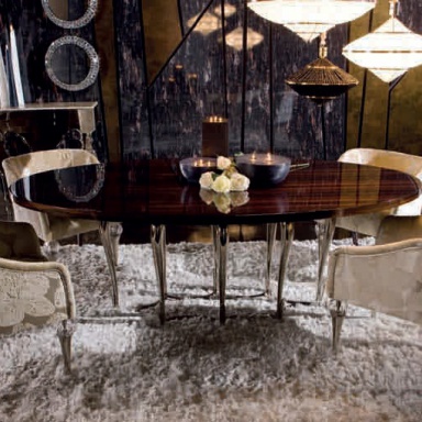 Flower dining table from the Italian manufacturer of design furniture JC Passion, made in the style of art Deco. Collection Of Pearl. The table top is oval, is made from solid ebony wood in a glossy finish. The base is Nickel-plated brass, finish to client's request. Colours in stock. A great option for living room in art Deco style.