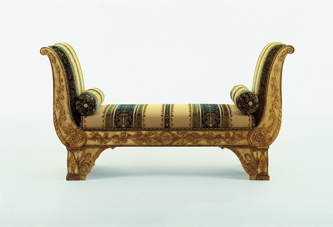 tempera lacquer, carvings in gold foil with patina finish. The frame is natural wood. Upholstery - textiles. The model is made in classic style. Colours in stock.