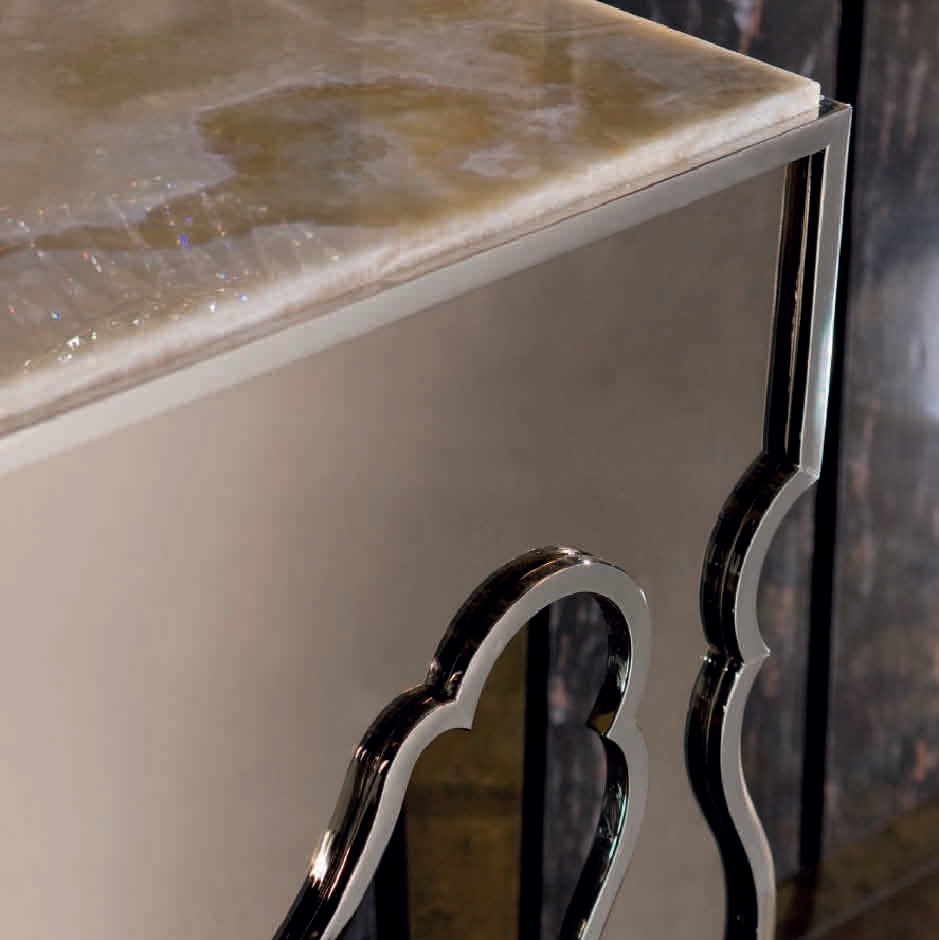 Console Alagon from the Italian manufacturer of design furniture JC Passion. Model of the collection Pearl in the style of art Deco. The table top of natural stone, marble. Legs are made from Nickel-plated brass, finish to client's request. Colours in stock. A great addition to your living room.