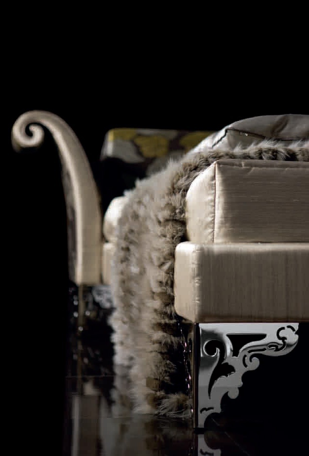 Double bed with upholstered headboard from Rialto Italian manufacturer of design furniture JC Passion. Model of the collection Pearl in the style of art Deco. Frame made of solid wood. Legs in laser perforated Nickel-plated steel. Upholstery - textiles from the company portfolio. Colours in stock. A designer option for your bedroom.