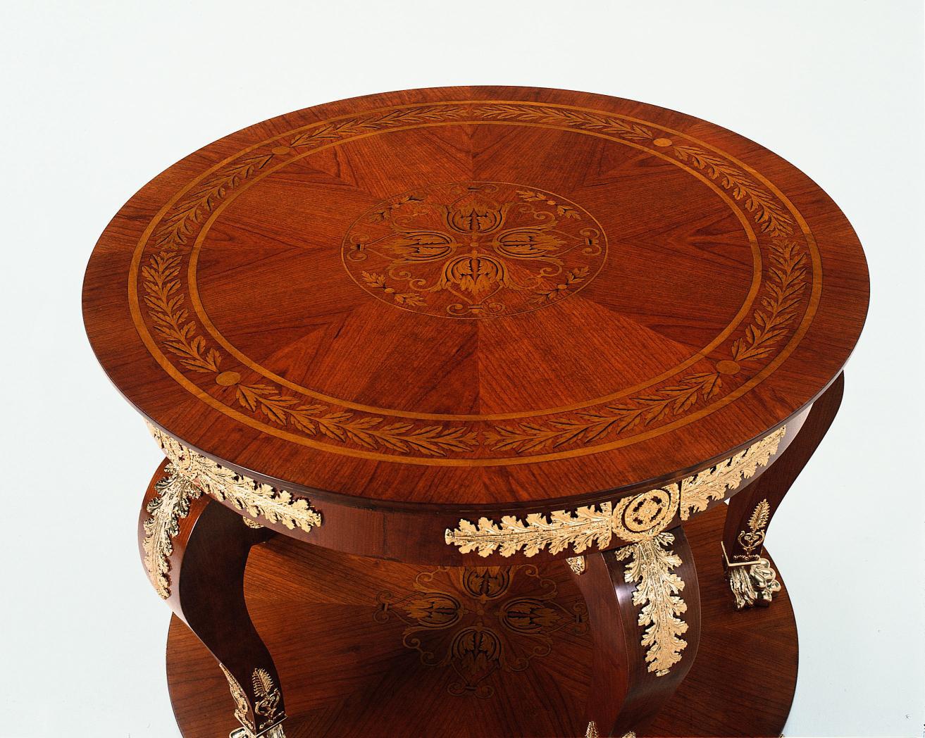 Coffee table S. I. P. ARR 09 from Italian manufacturer Colombo Stile. Legs, table top - natural wood. Finish: cherry wood with inlays in various woods. Gold-plated brass overlay. The model is made in classic style. Colours in stock.