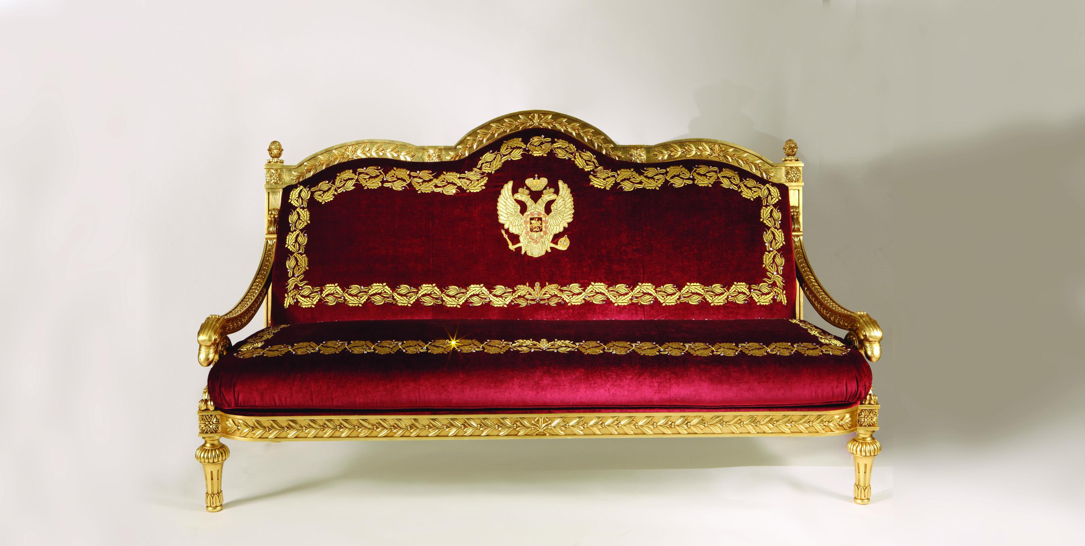 Two seater sofa with a frame made of natural wood S. I. P. ARR 09 from Italian manufacturer Colombo Stile. Finish: gold foil