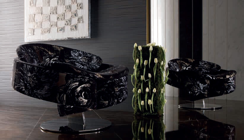 The chair on a rotating basis from Ginevra Italian manufacturer of design furniture JC Passion, in the art Deco style. Collection Of Pearl. The frame is made from solid wood. Stainless steel base, trim on request. Upholstery - textiles from the company portfolio. Colours in stock. Designer addition for interior living room.