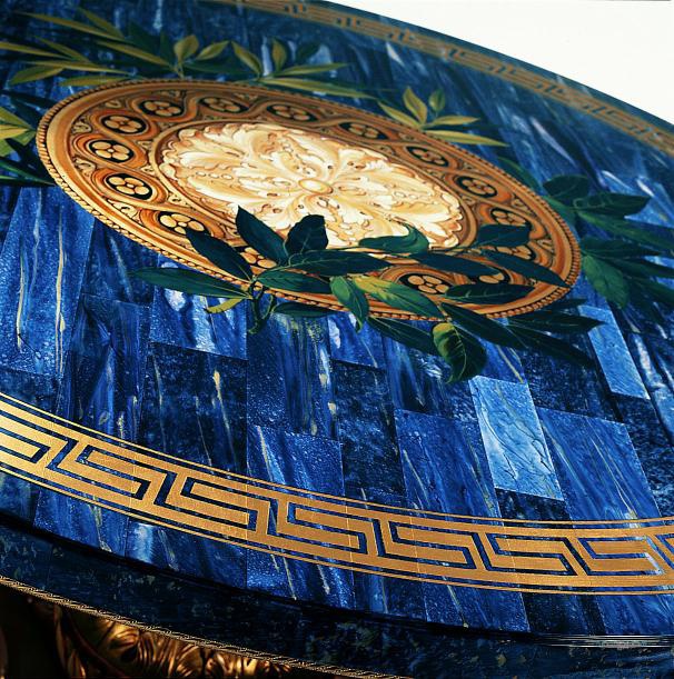 Dining table S. I. P. ARR 09 from Italian manufacturer Colombo Stile. Finish: polishing under the cherry blossoms, gold foil, inlay of various woods. Glossy lacquer with inlaid imitation of lapis lazuli. Handmade paintings. The frame is natural wood.The model is made in classic style. Colours in stock.