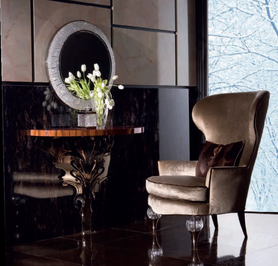 The Grenada arm chair from the Italian manufacturer JC Passion. Frame and rear legs are made from solid wood, the front legs in Nickel-plated brass. D?cor items - crystal balls. Upholstery - textiles. A great model for living room in art Deco style. Colours in stock.