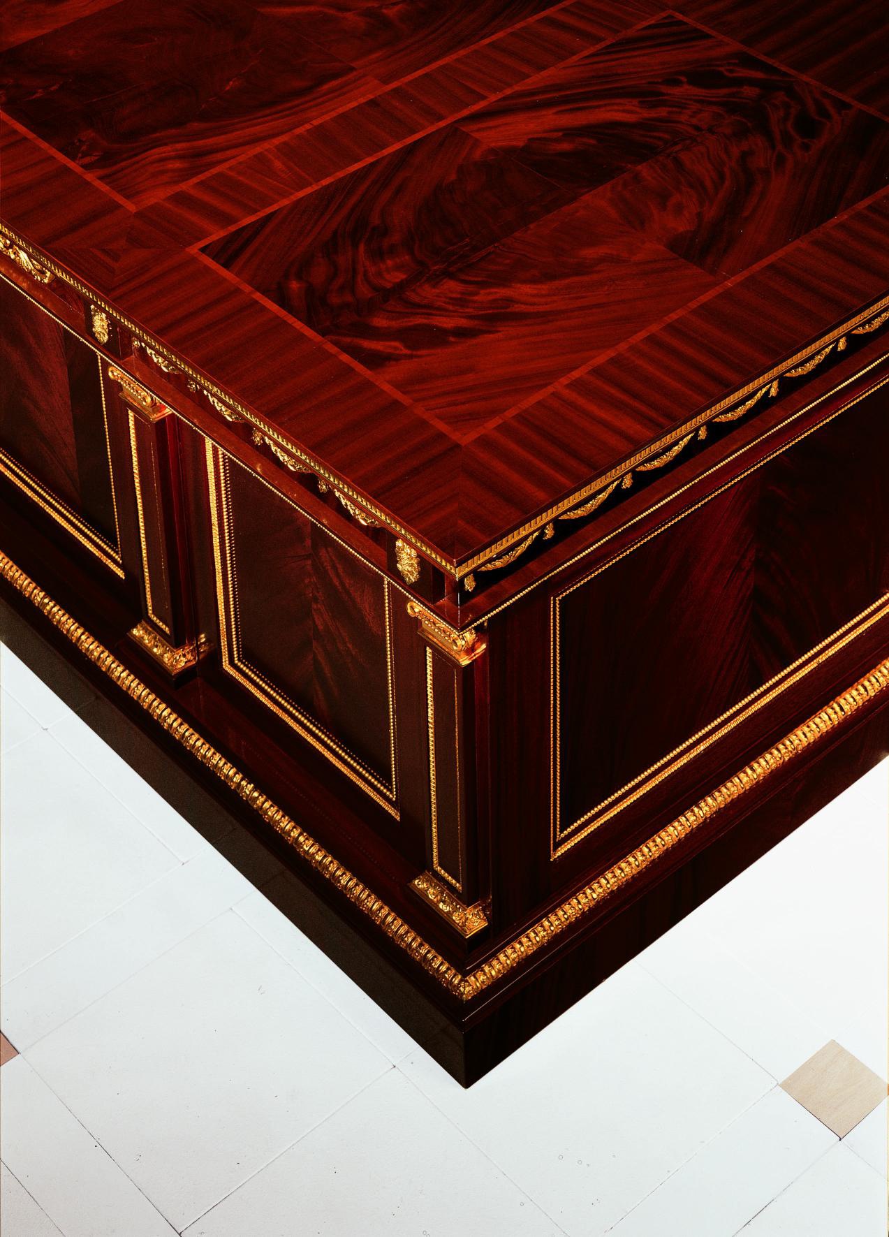 Desk S. I. P. ARR 09 from Italian manufacturer Colombo Stile. The frame is natural wood. Finish: mahogany encrusted, gold-plated brass overlay. Elegant and stylish element of classic interior.