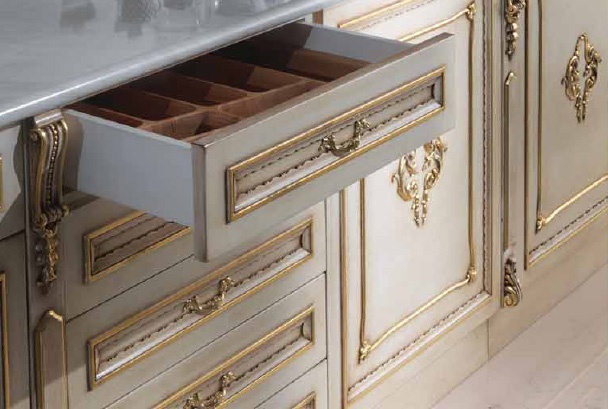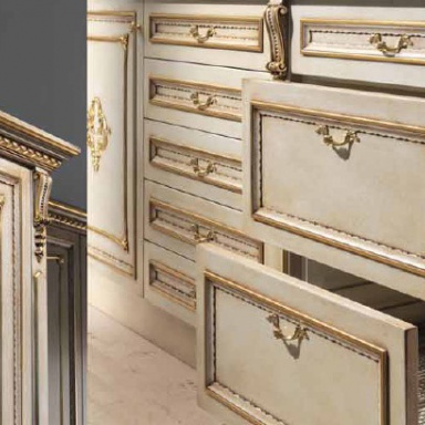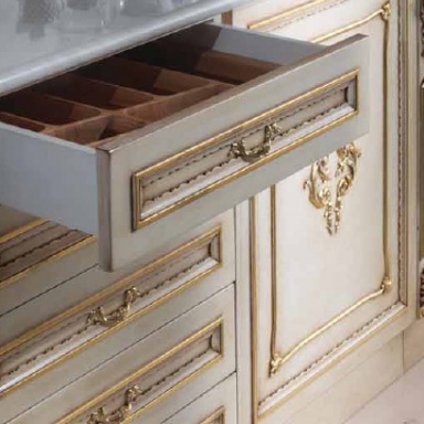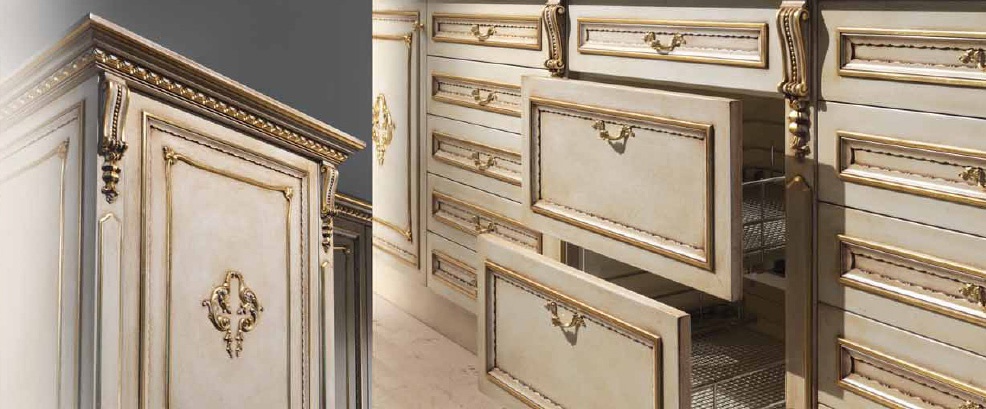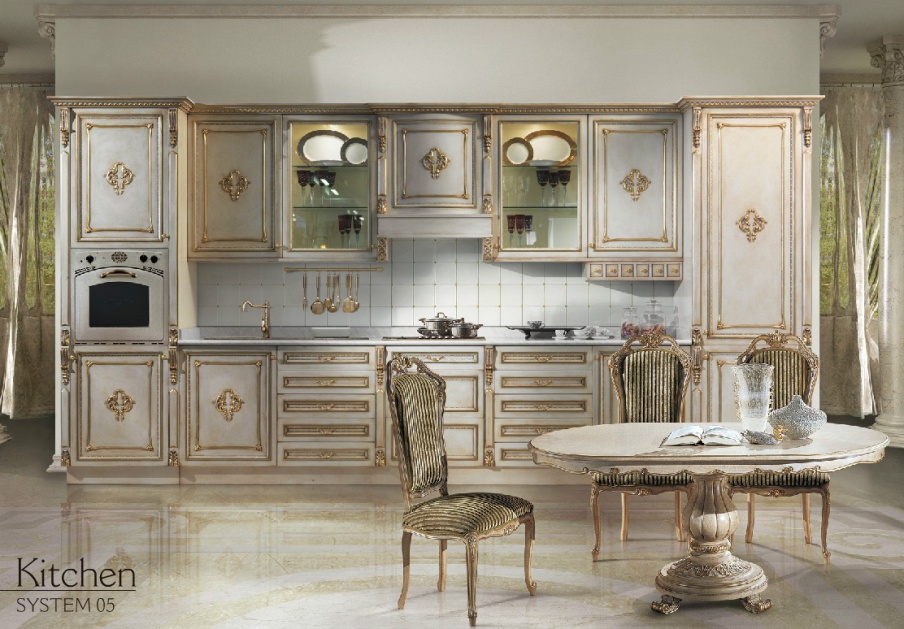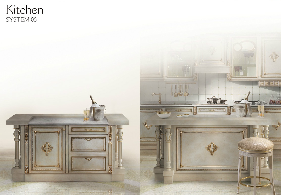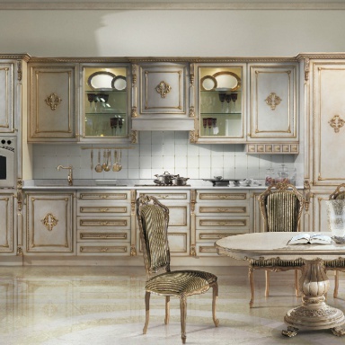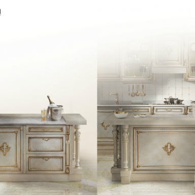 Set for the kitchen from Italian manufacturer Angelo Cappellini. Presents headsets for classic kitchens of wood. Furniture for the headset is equipped with spacious drawers, glass shelves and hinged lockers with wooden doors and island with work surface and dining table. The colors offered from the company portfolio. The kitchen is decorated with Golden decorative elements.